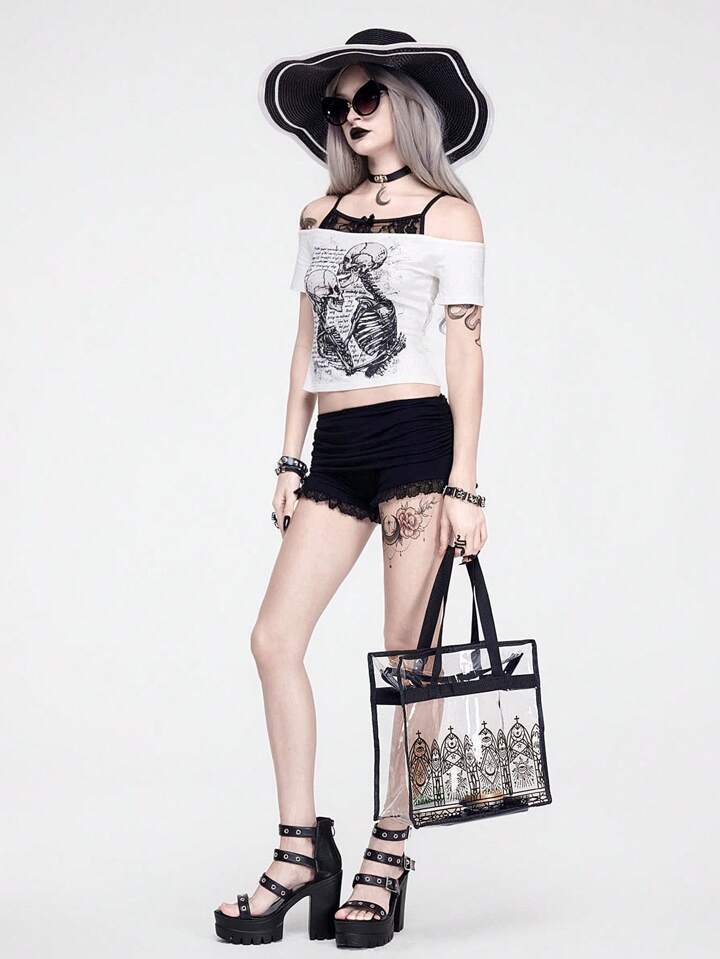 Goth 1 Stück Damen transparente schwarze Tragetasche mit Sonne, Mond, Stern und Kreuz Muster, wasserdicht für täglichen Gebrauch, Einkaufen und Strandnutzung