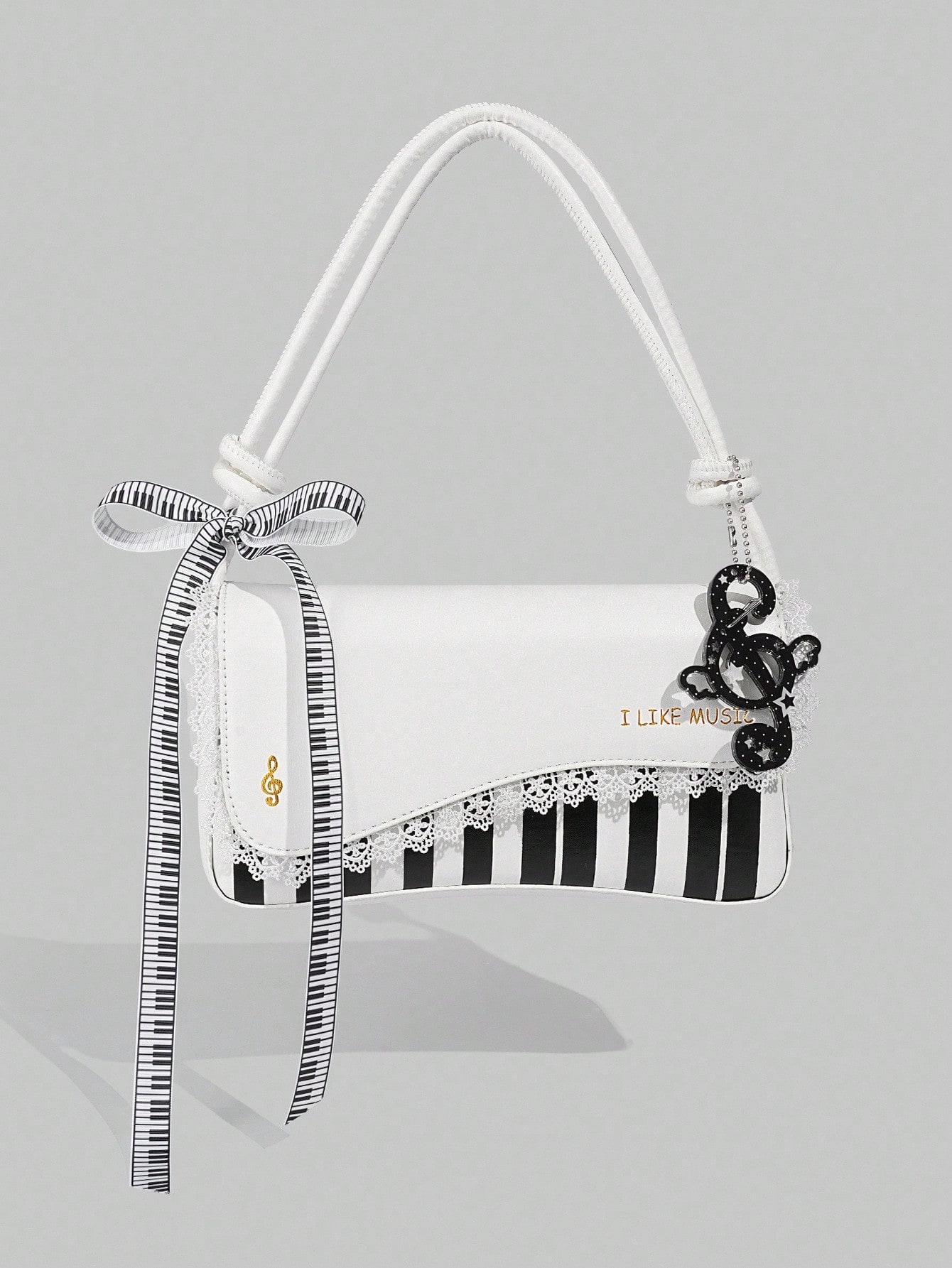 Goth 1 Stück Y2K Musik Festival Schwarz & Weiß Klaviertasten Muster Umhängetasche, Musik Note & Stern Subkultur Handtasche, Schleife & Spitze Dekoration Unterarmtasche, Studenten Tagesrucksack