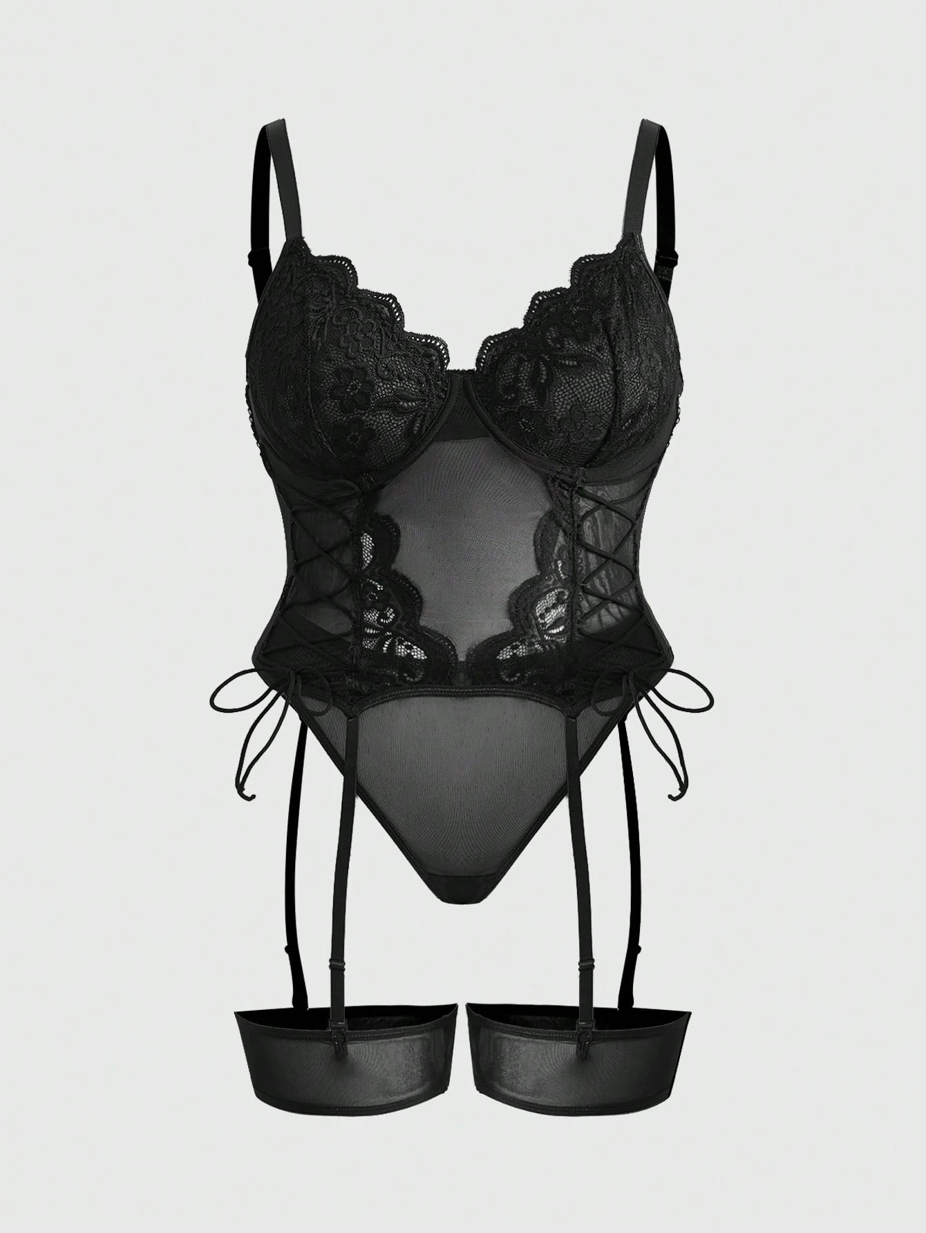 Goth 4 Stücke Große Größen Spitze Patchwork Mesh Kordelzug Design Unterbügel Sexy Dessous Set