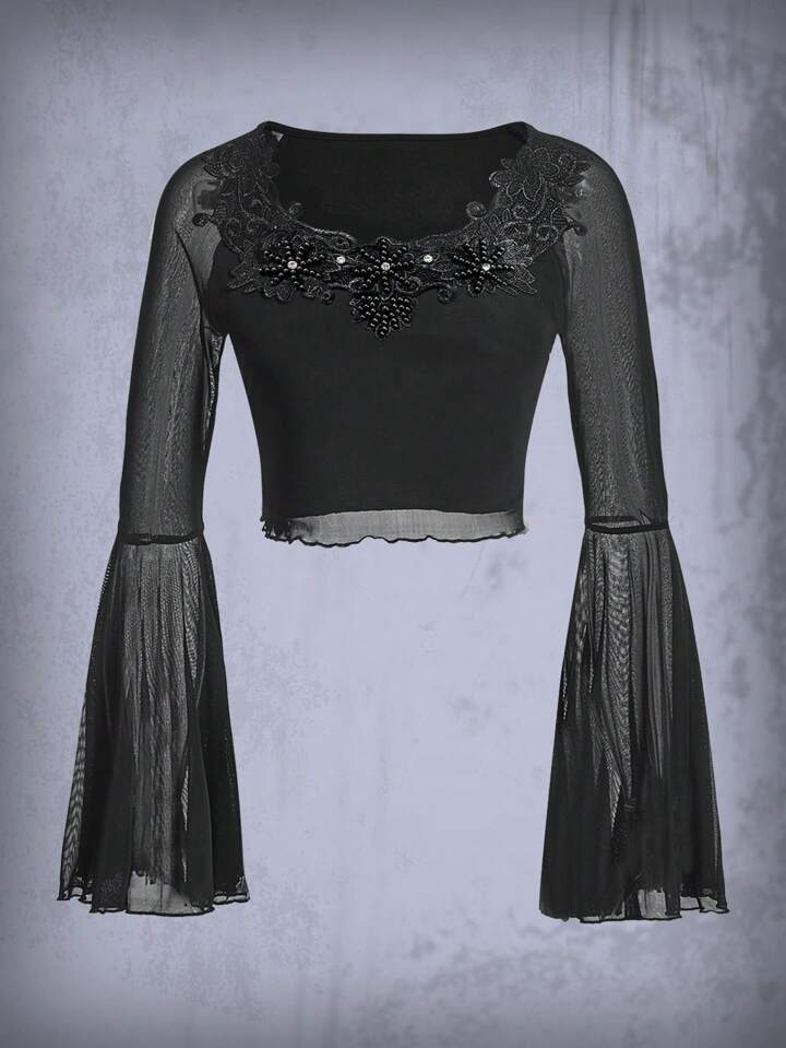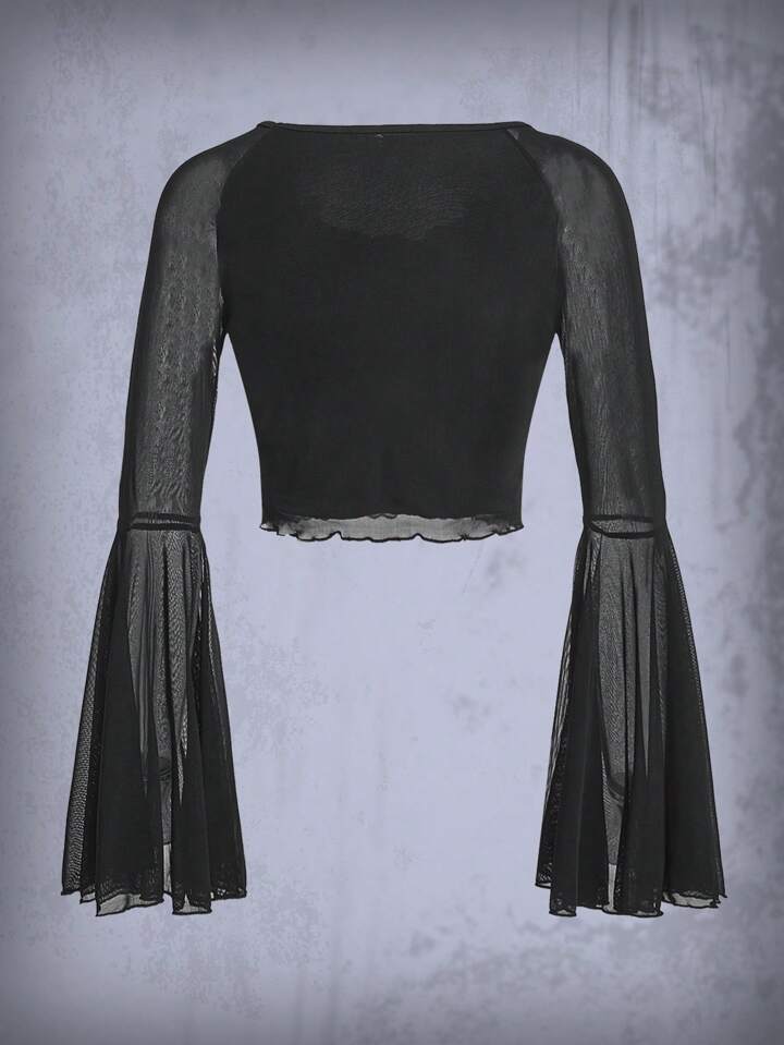 Goth Top mit Applikation, Volant Ärmeln, Mesh
