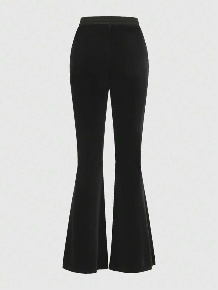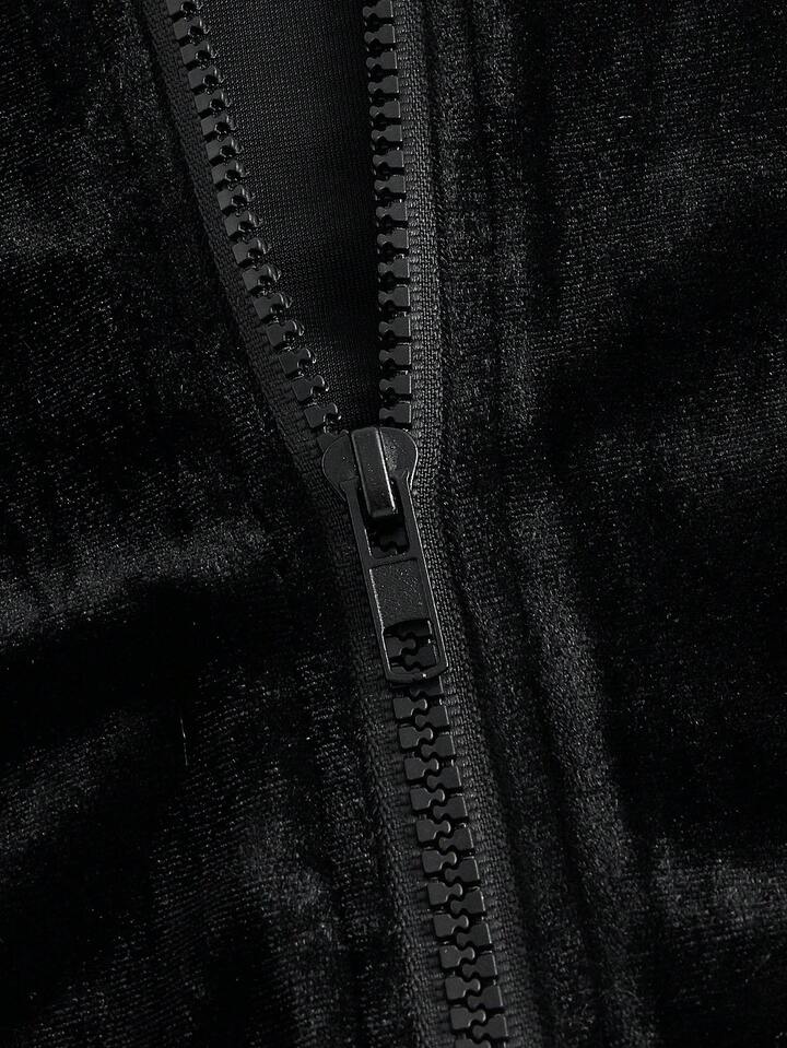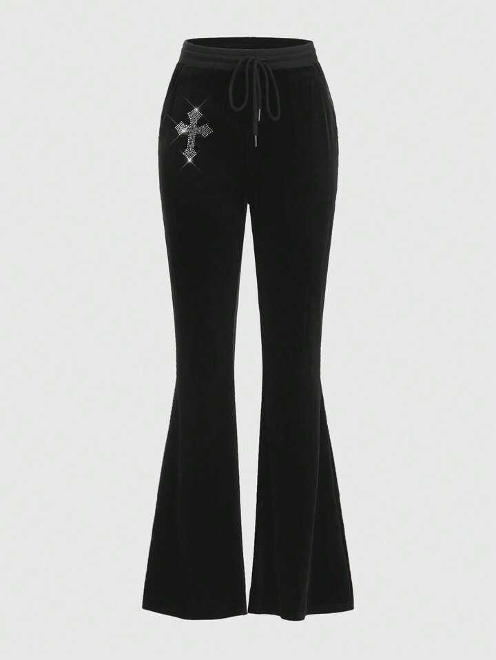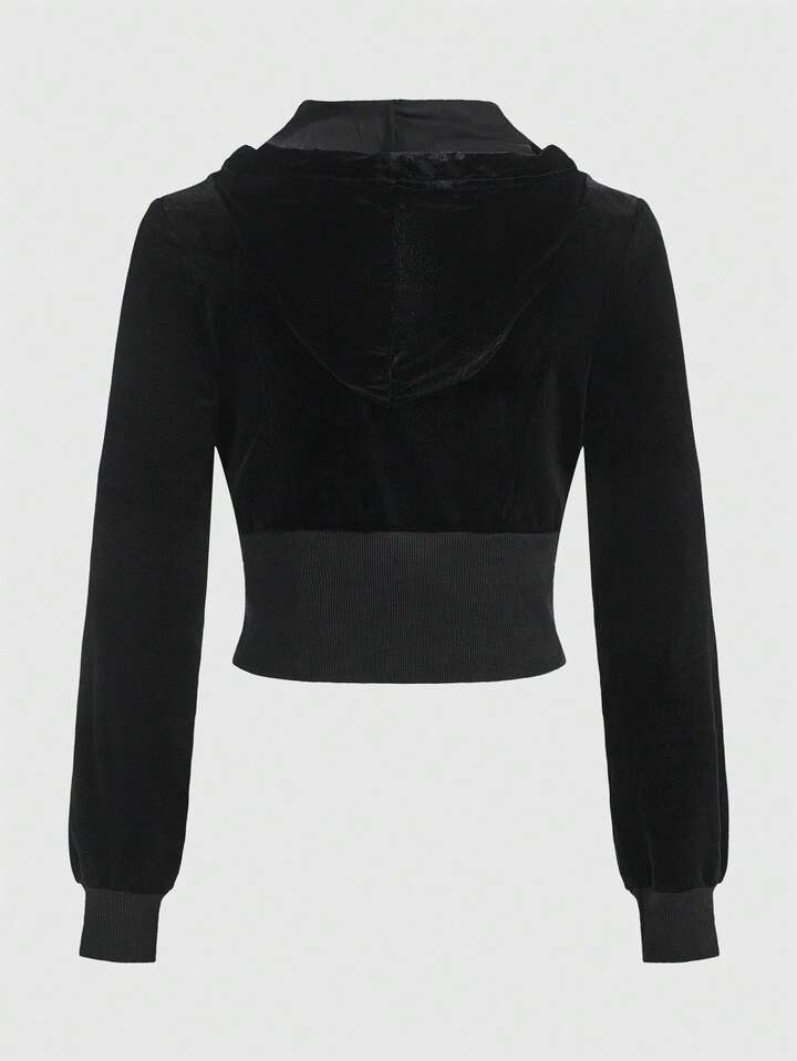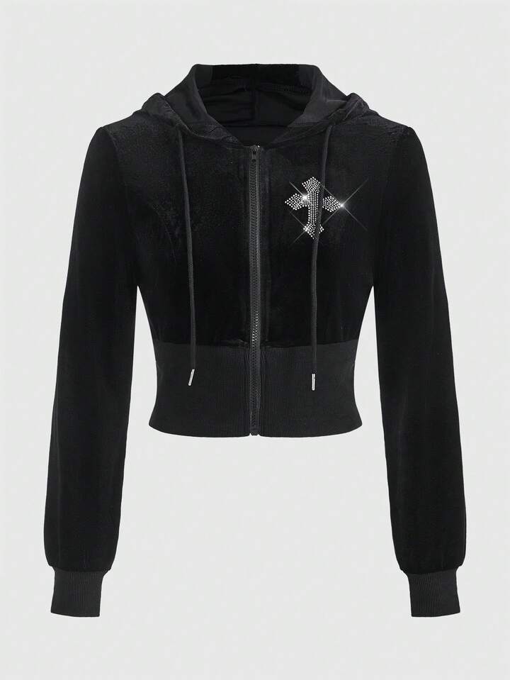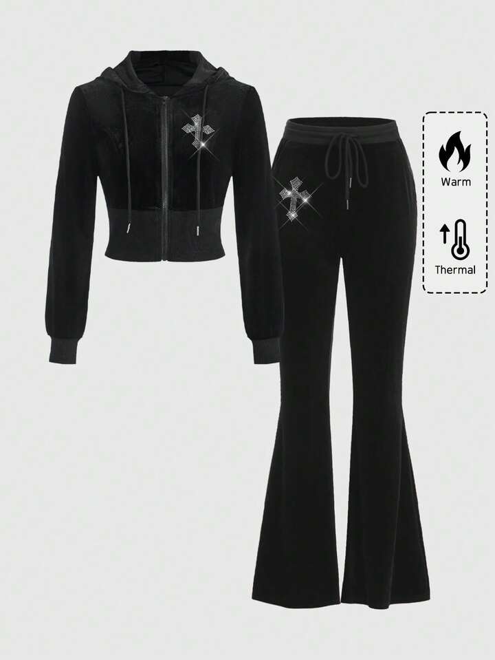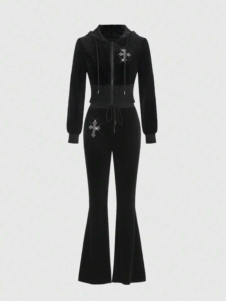 Goth Baddie Lässig Y2K Kapuzenpullover mit Strass-Kreuz-Frontzipp & weite Hose Set mit Schleifenkrawatte & Samtgewebe, dehnbar gestrickt in einfarbigem Schwarz, Damen