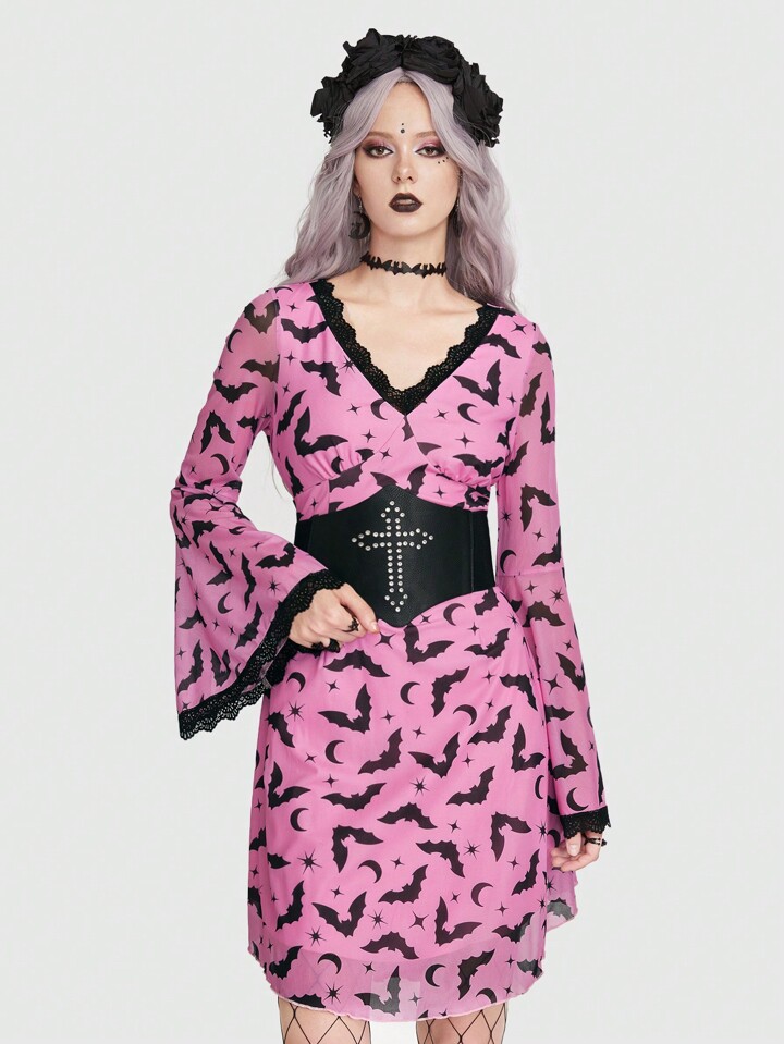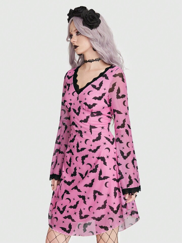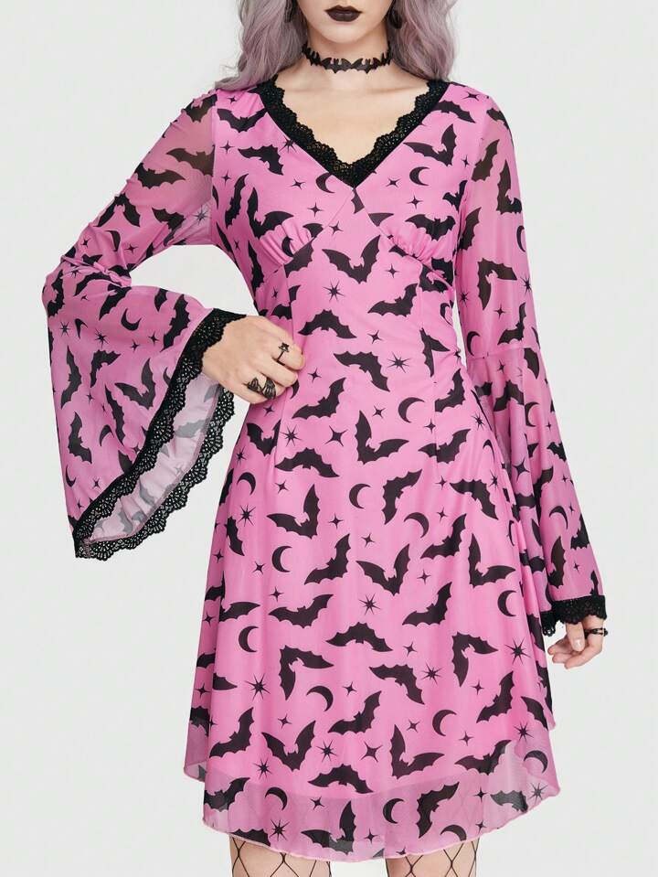 Goth Kleid mit Fledermaus Muster, Kontrast Spitzen, Glockärmeln, ohne Korsett