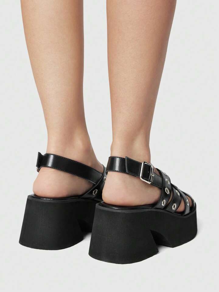 Goth Schwarze Punk-Stil Plateausandalen mit rundem Zehenbereich, Multi-Riemen Design, PU-Leder Material, geeignet für Abschlussfotos & Bürokleidung