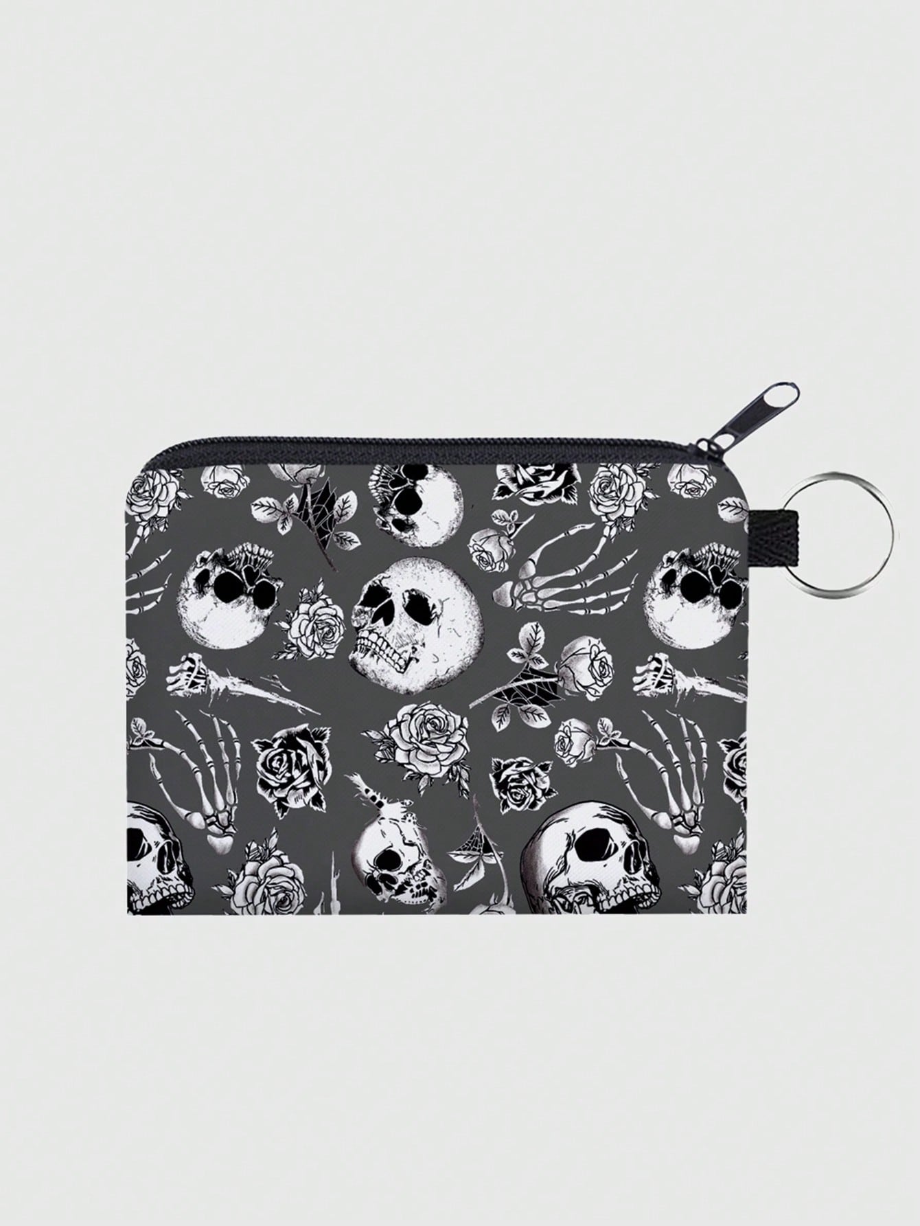 Goth Schwarze Münzgeldbörse aus Polyester mit Totenköpfe und Rosen Muster, Reißverschluss, Geldbeutel für Frauen, Urlaubsgeschenk