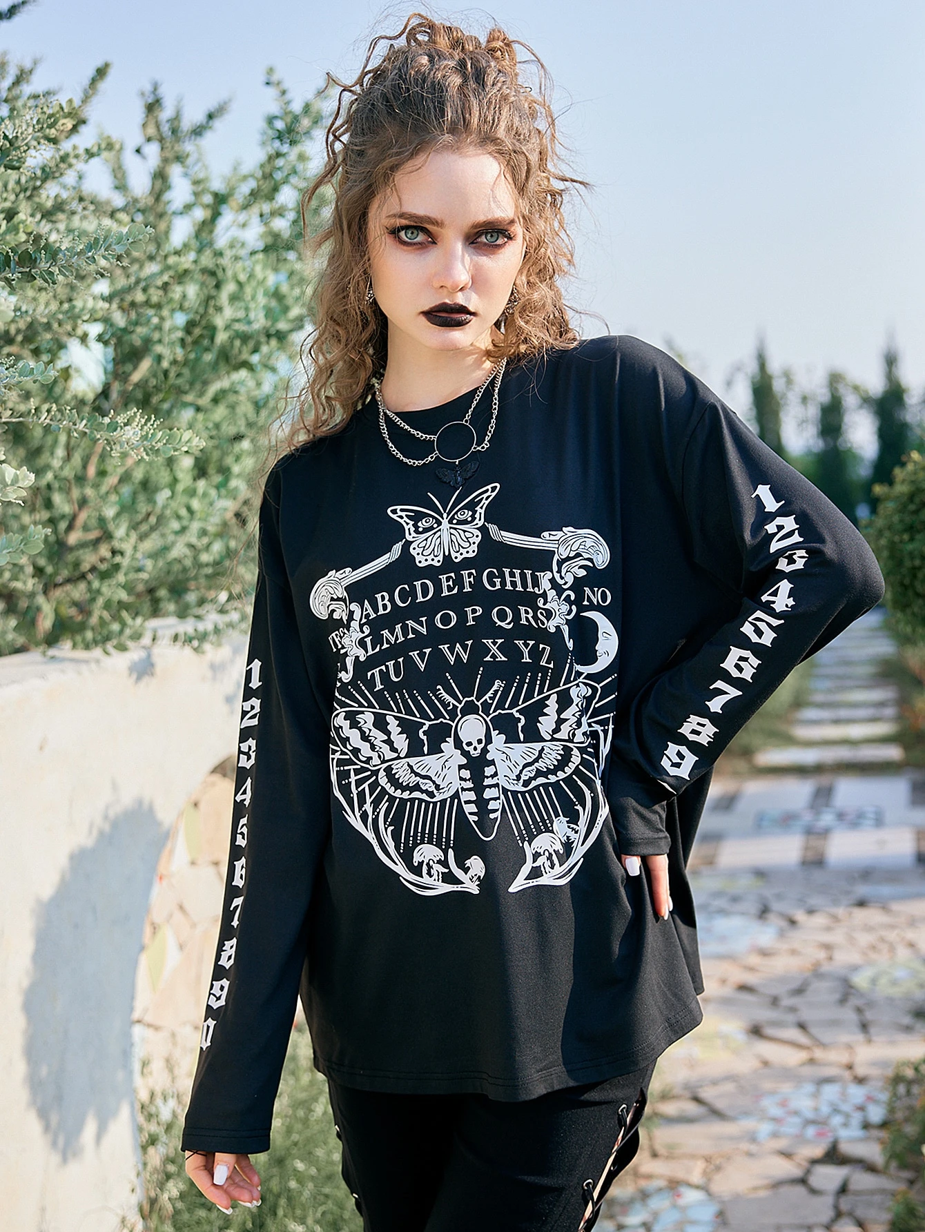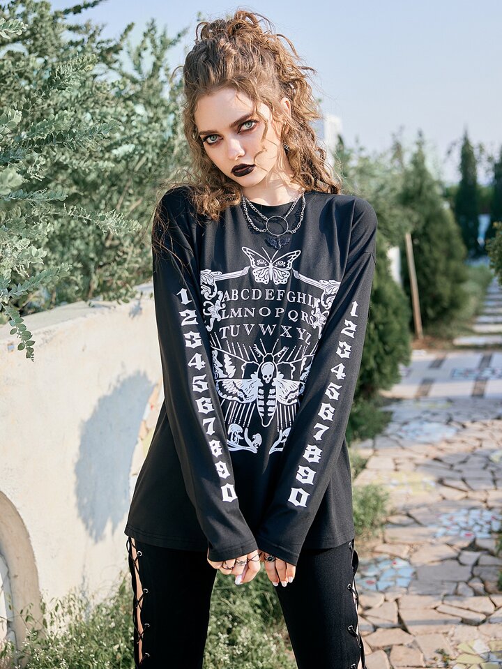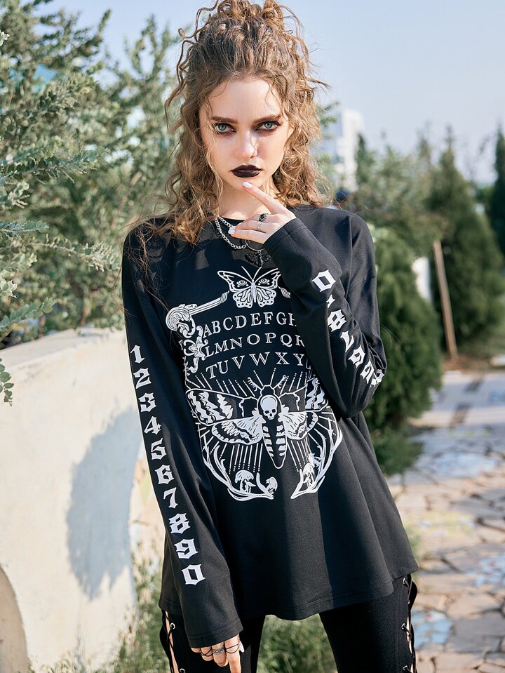 Goth Drop Shoulder T-Shirt mit Schmetterling & Buchstabe Grafik