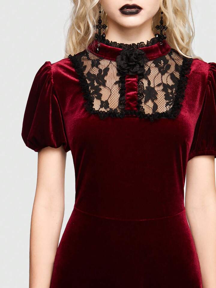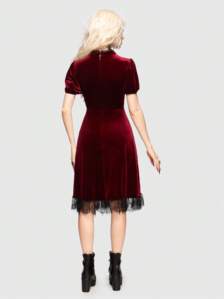 Goth Kleid mit Kontrast Spitzen, Puffärmeln, Samt ohne Handschuhe