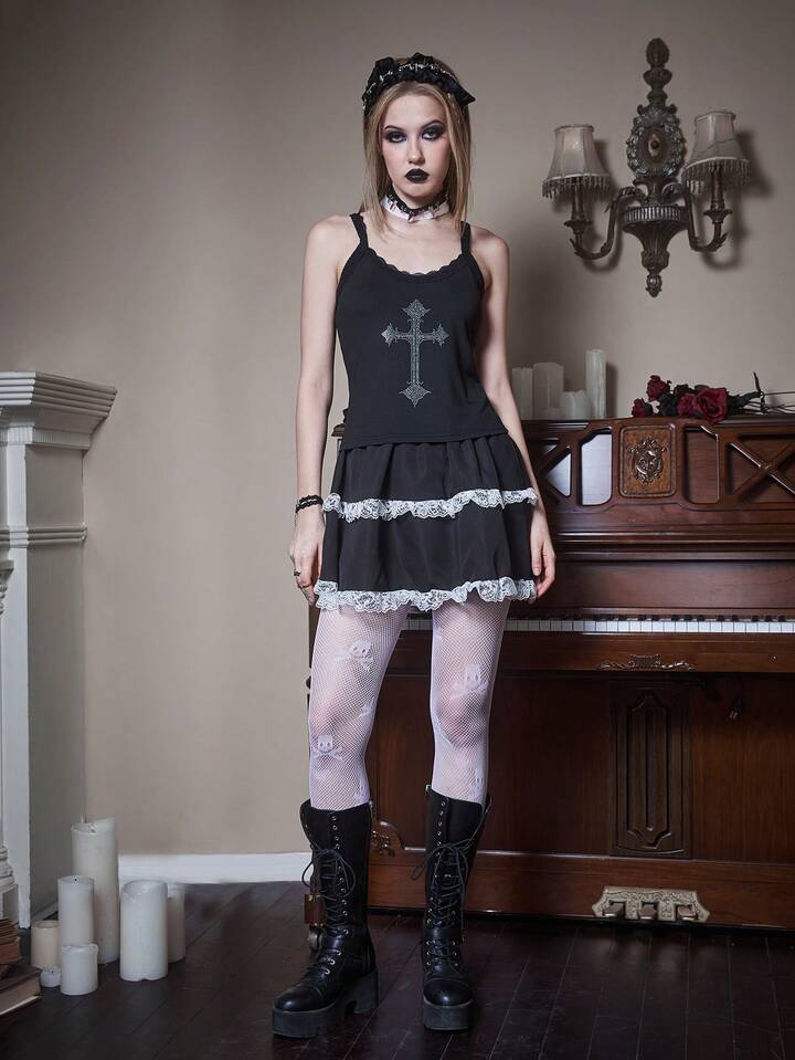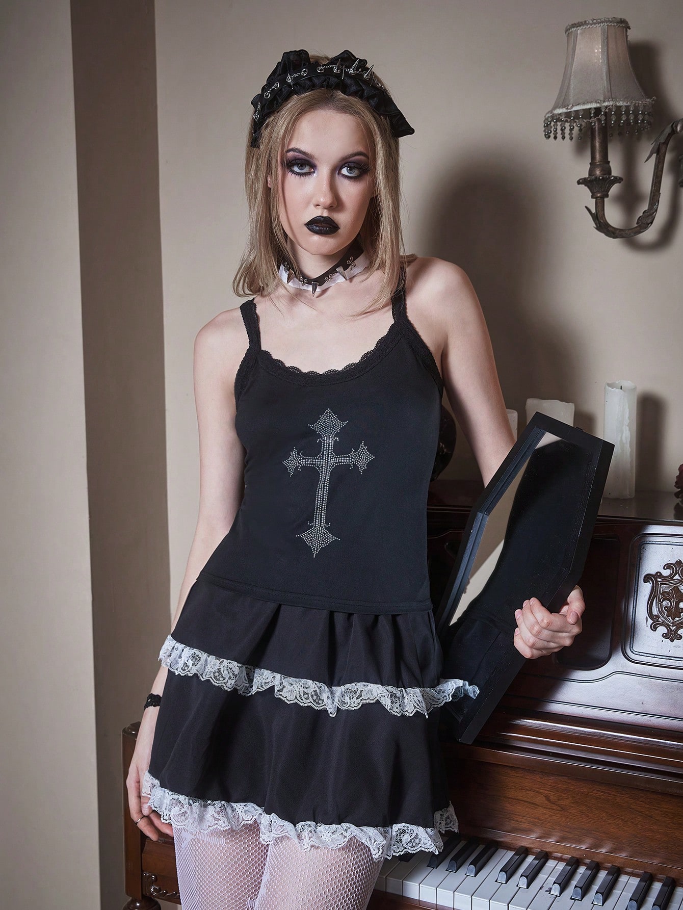 Goth Cami Top mit Kontrast Spitzen, Strass, Kreuz Muster,