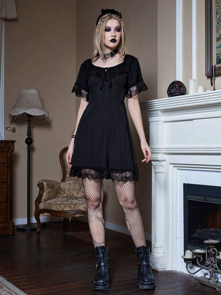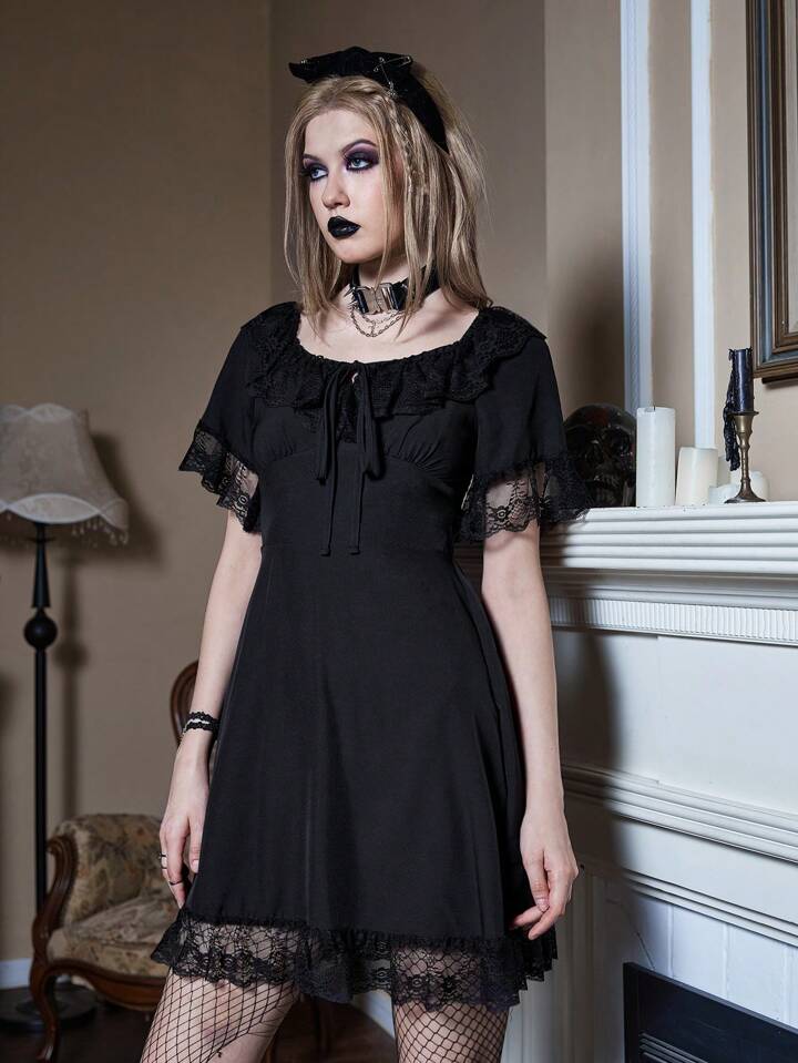 Goth Kleid mit Kontrast Spitzen, Band vorne,