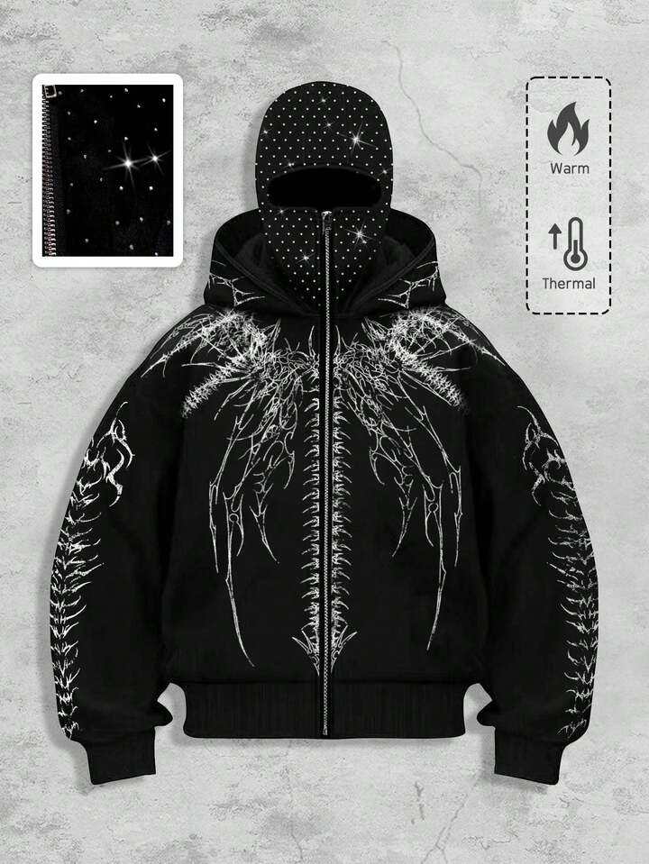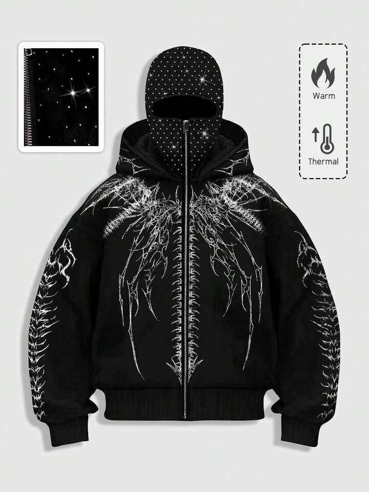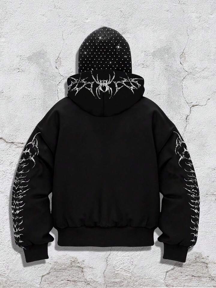 Goth Coole dunkel-stilvolle Kapuzen-Reißverschluss-Sweatshirt mit Strass-Verzierung, Herren Jacke, Herbst Winter