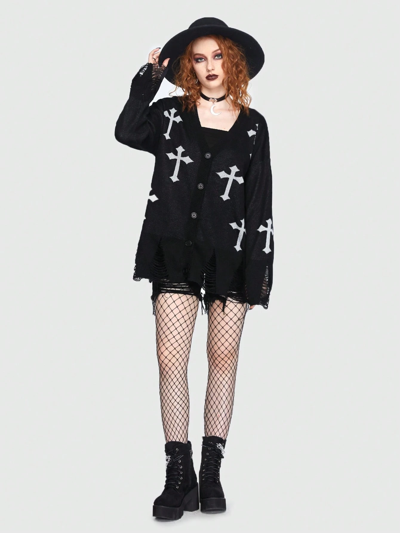 Goth Cardigan mit Kreuz Muster, Riss, Riss,