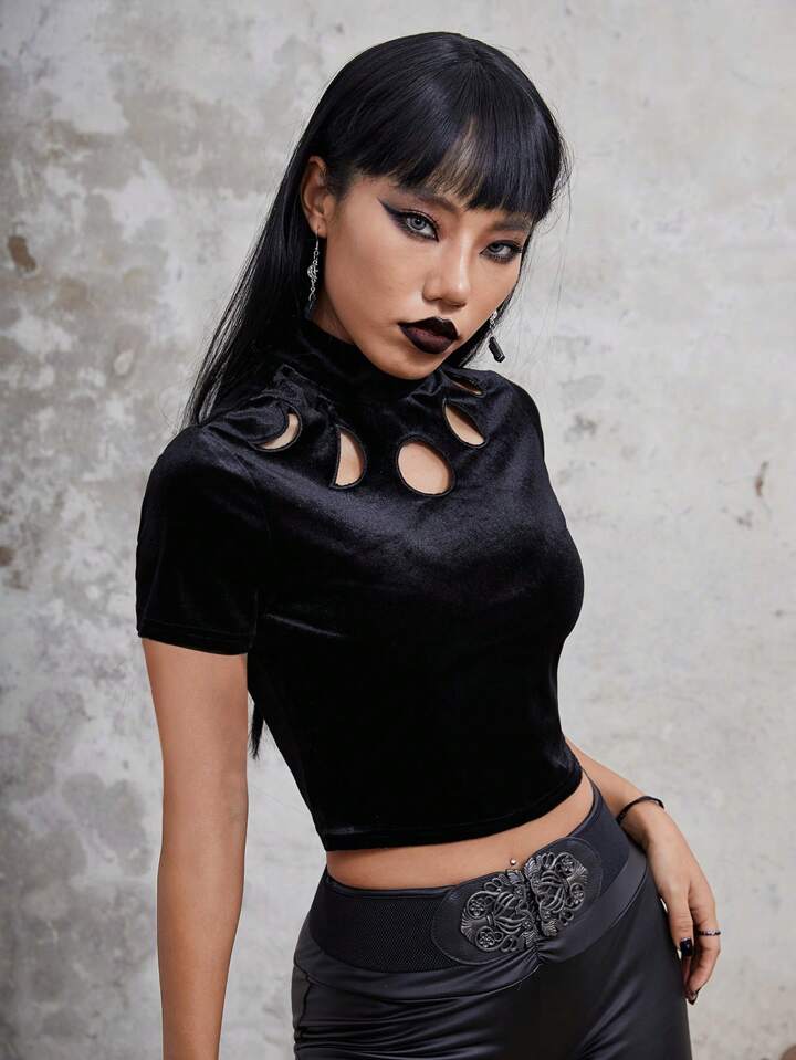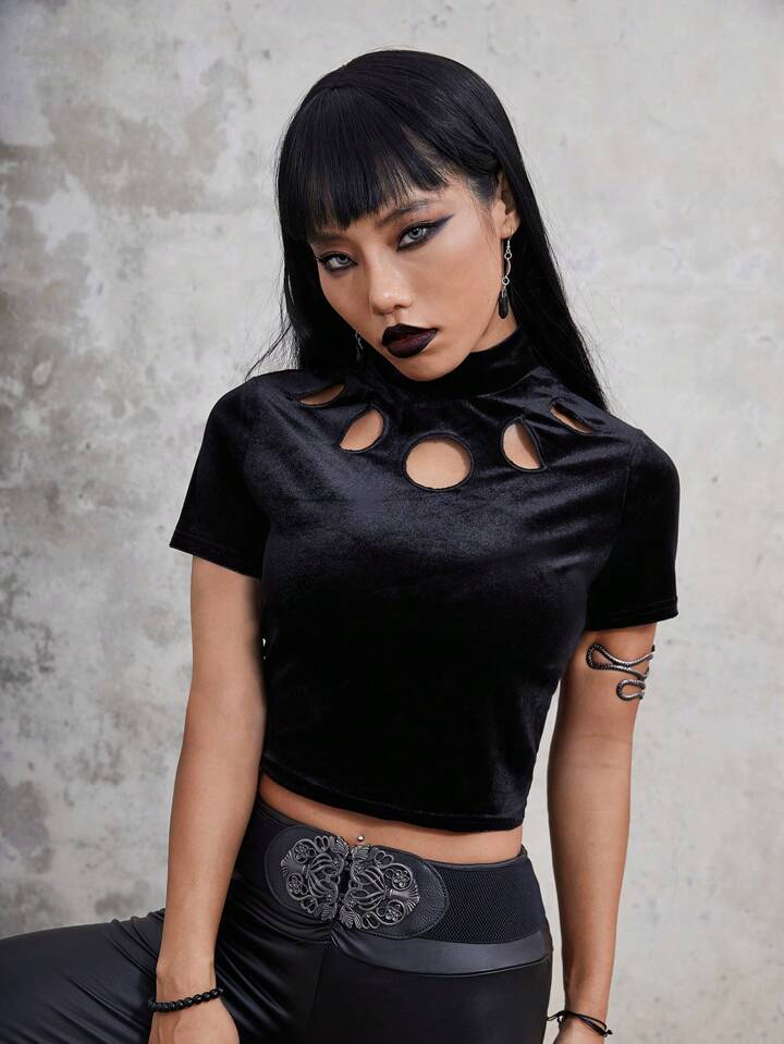 Goth Crop T-Shirt mit Ausschnitt, Stehkragen,
