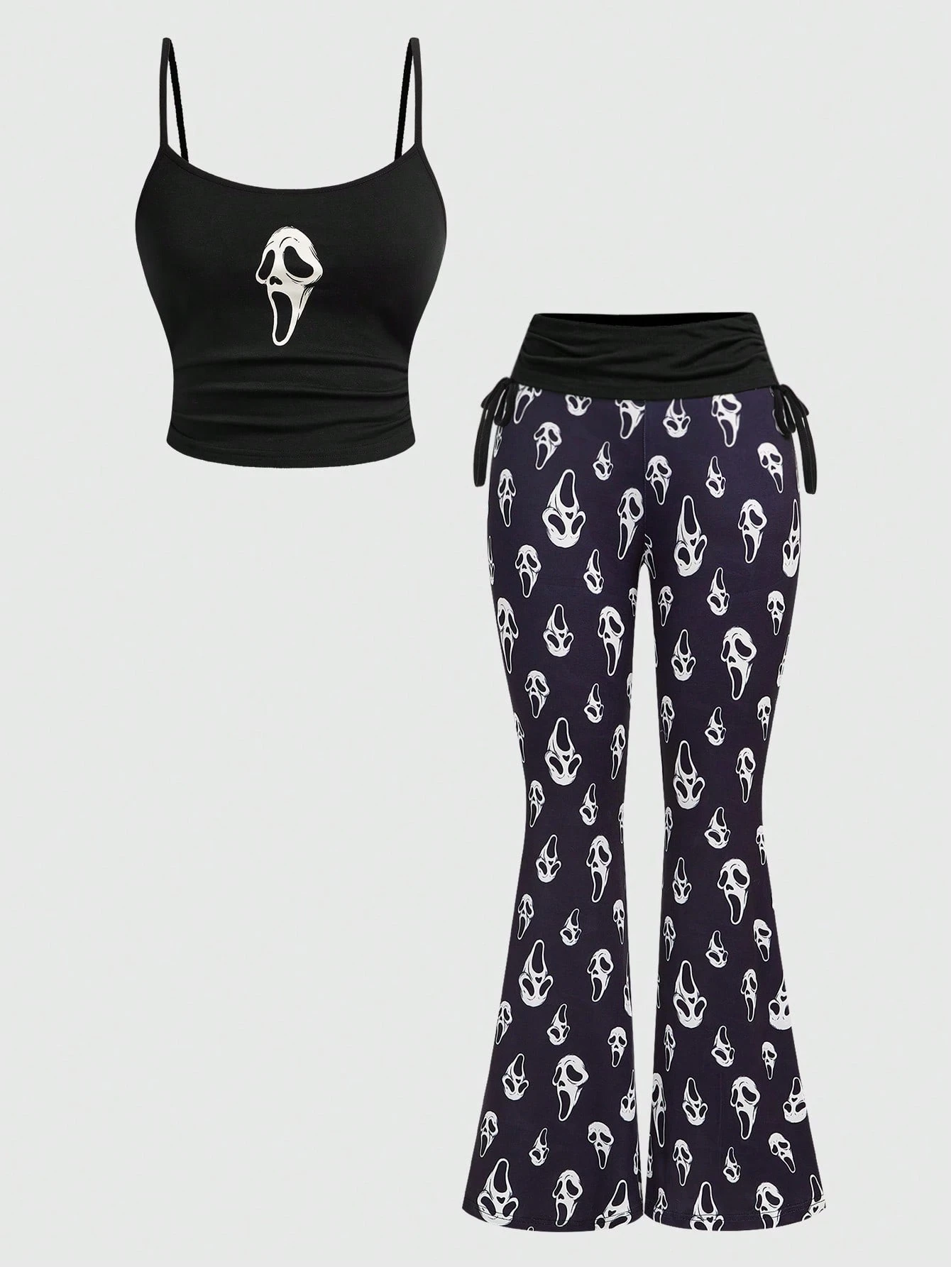 Goth Dunkel Skelett Muster Figurbetontes Camisole Top kombiniert mit Skelett Allover Muster Weite Hose