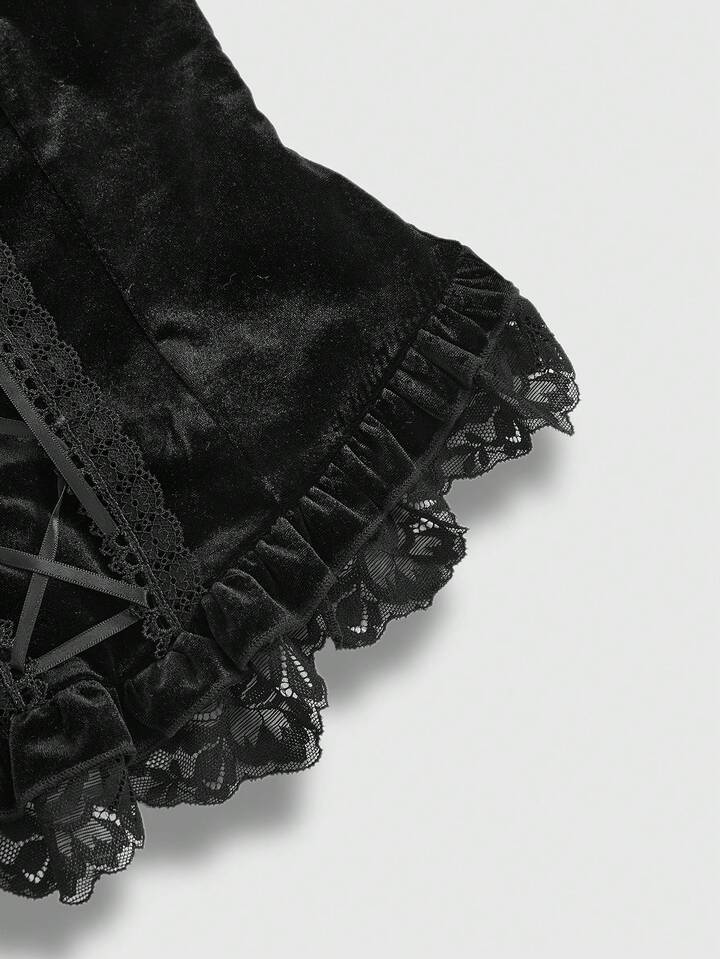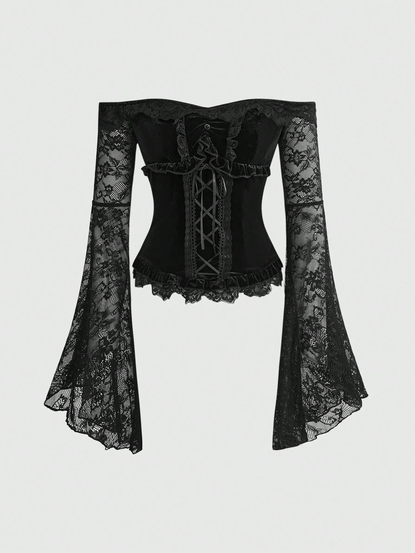 Goth Dunkler Samt & Kontrast Spitze Off-Shoulder Damen Bluse