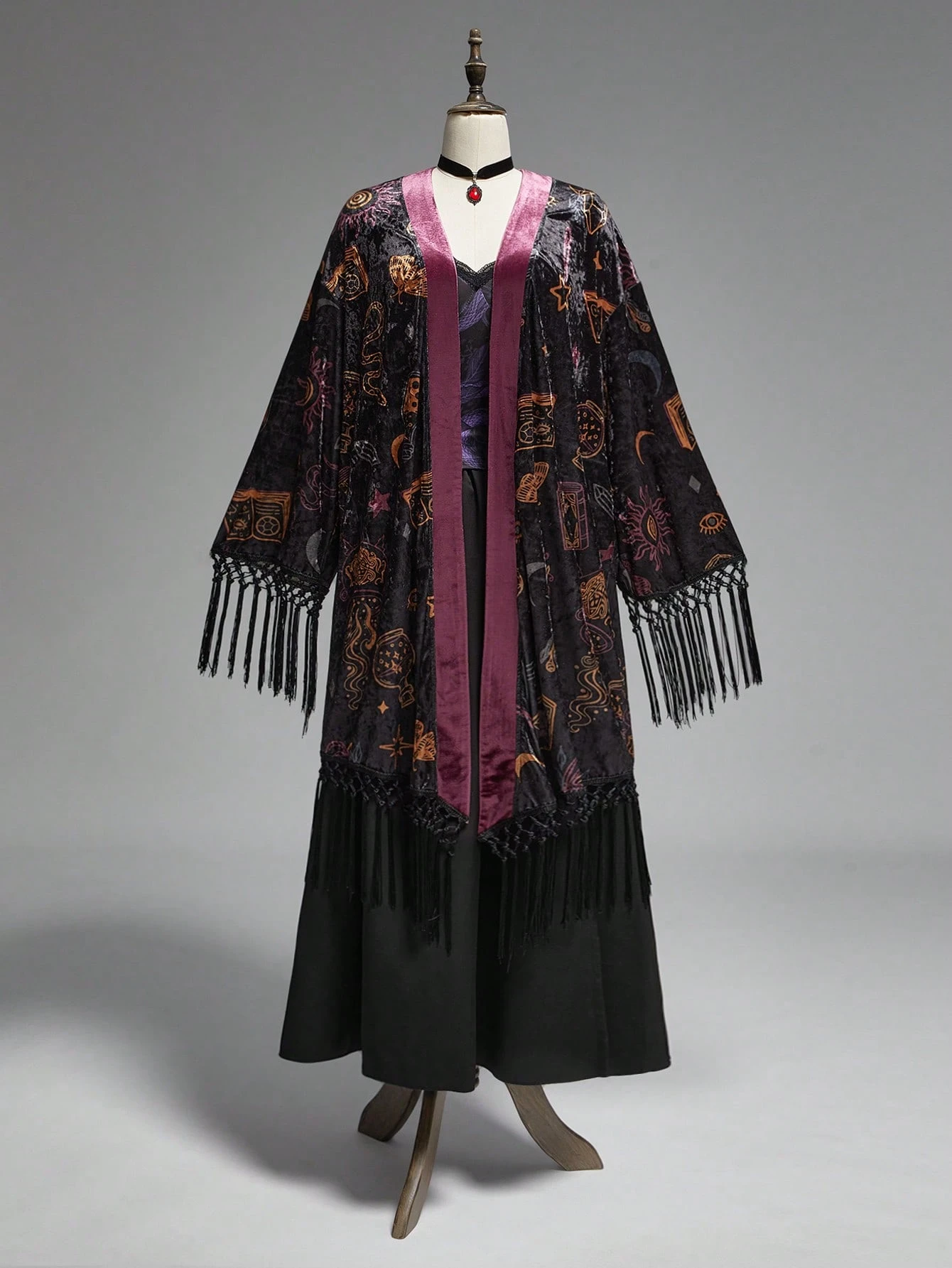 Goth Dunkle Hexe Kristallkugel Mysteriöses Auge Kerzenhalter Buch Samt Allover Muster Patchwork Quaste Cover-Up Schal