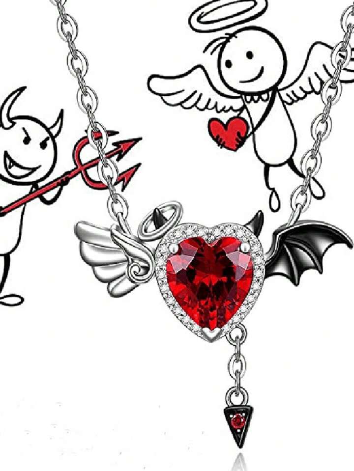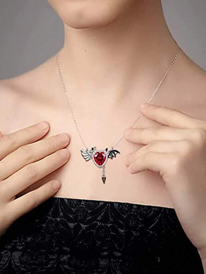 Goth Teufelsengel Flügel Herz förmiger Anhänger Halskette mit Strass und Kette zu Valentinstag