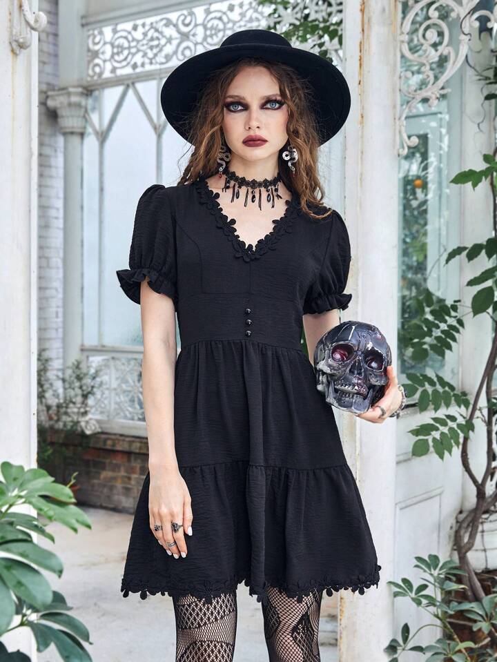 Goth Kleid mit Blume Applikation, Puffärmeln, Rüschenbesatz,