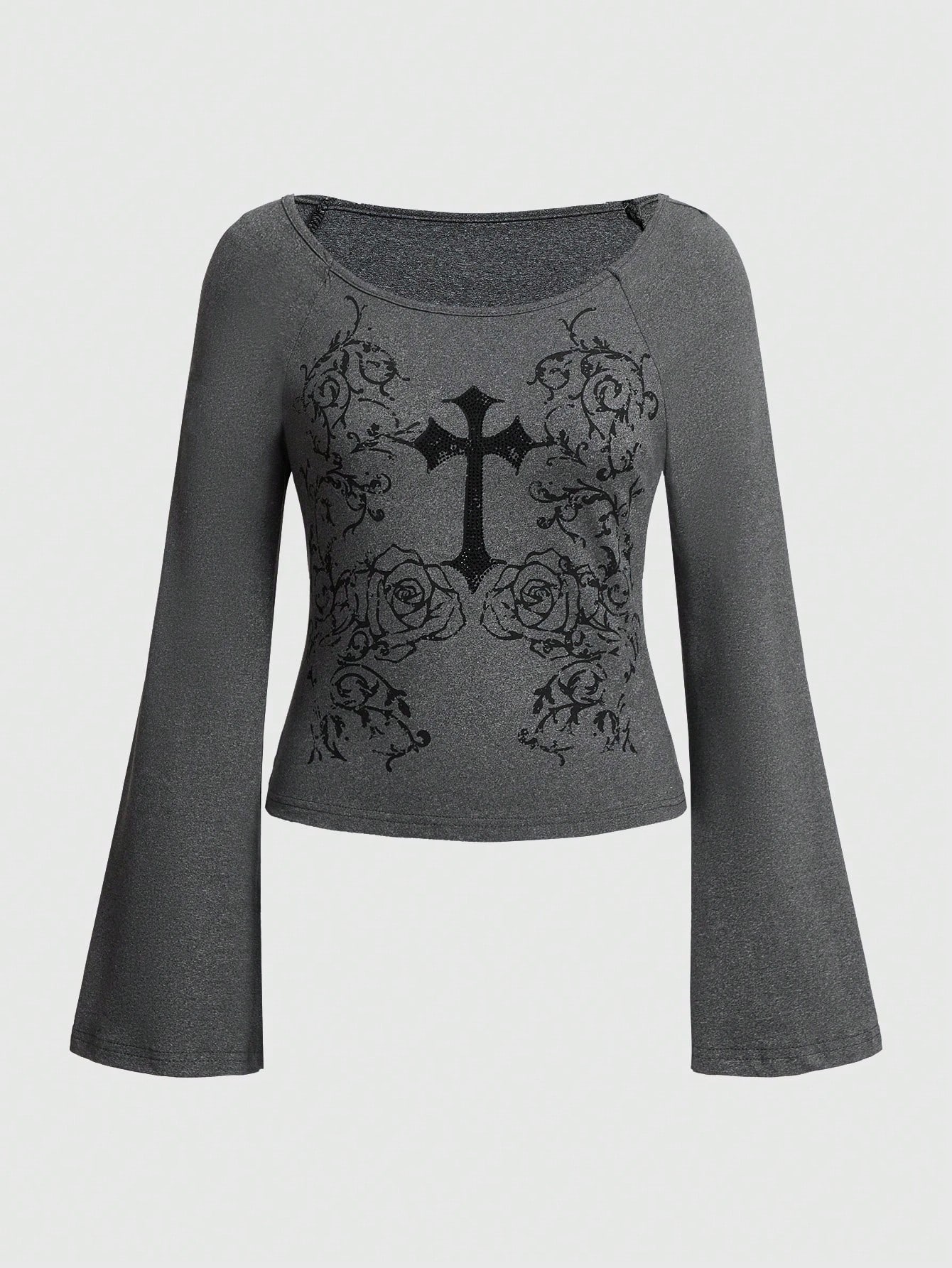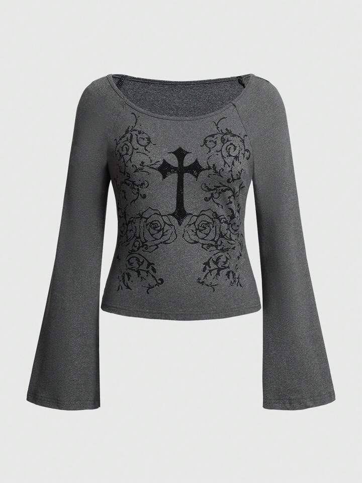 Goth T-Shirt mit Blumen- und Kreuzmuster, ausgestellten Ärmeln