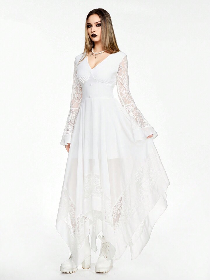 Goth Gotischer Stil sexy tiefer V-Ausschnitt Glockenärmel asymmetrischer Saum Kontrast Spitze Taille Kleid