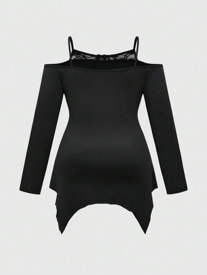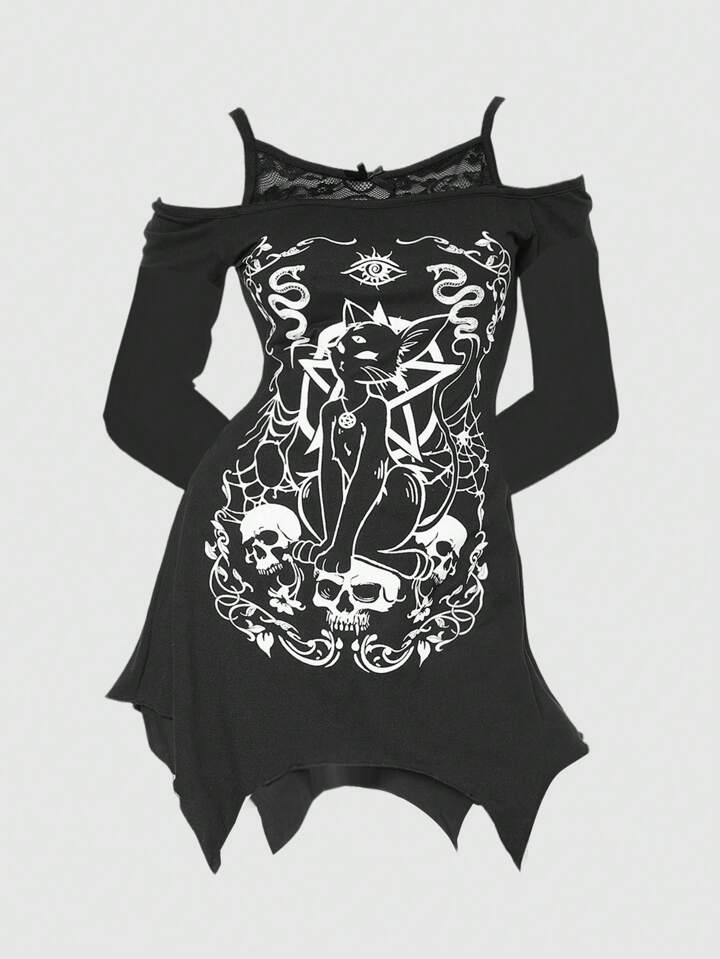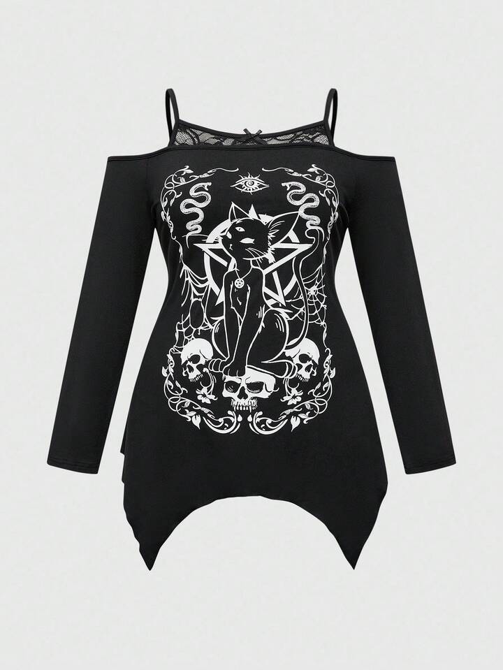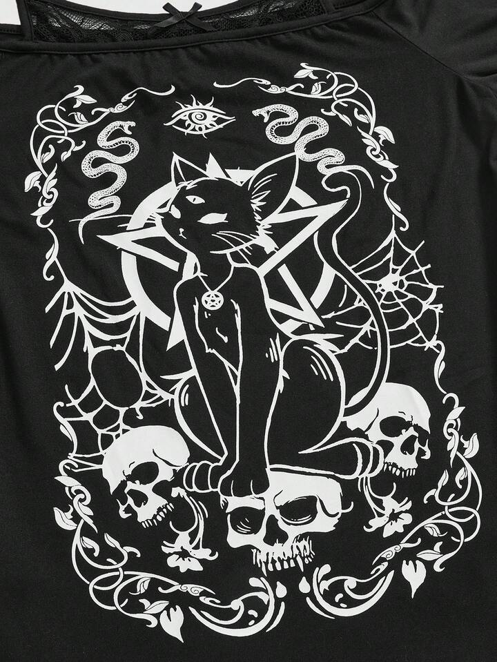 Gyaru Sommer Goth Girl Mysteriöser Katzen-Stern-Schädel-Muster asymmetrischer Saum Carmen-Ausschnitt Spitzen-Cami Schwarzes Große Größen Langarm T-Shirt, Halloween