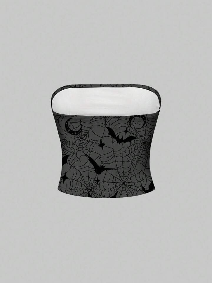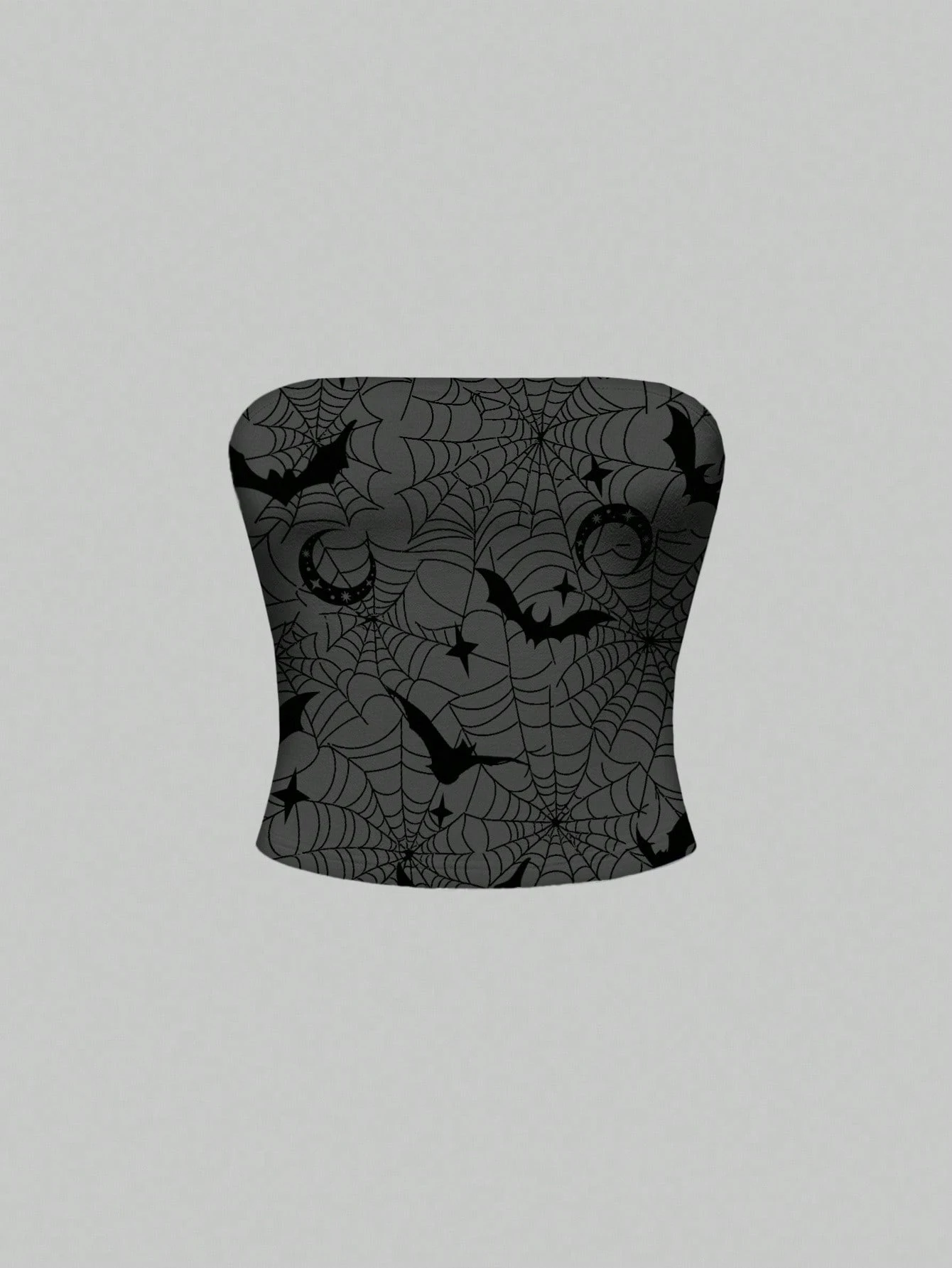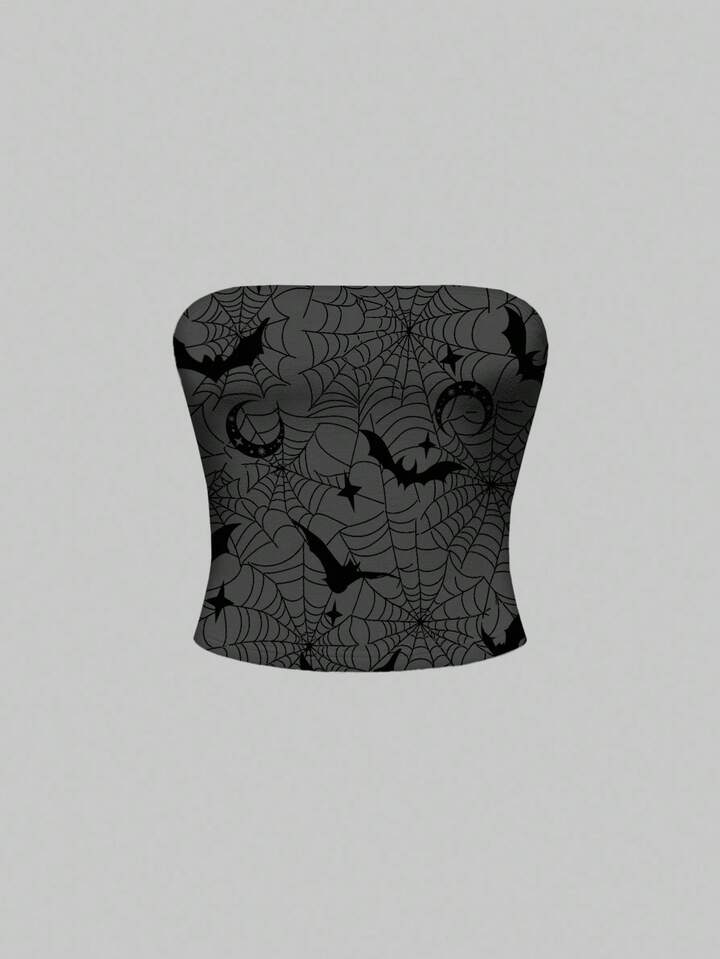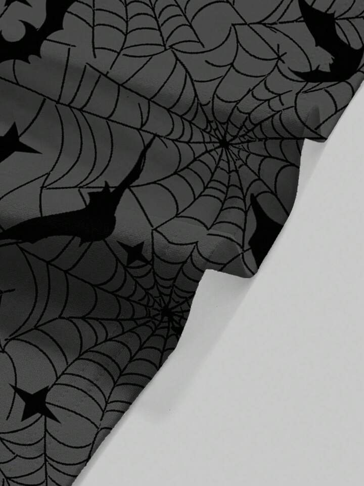Goth Halloween dunkel lila Spinnennetz, Fledermaus, Sonne, Mond, Stern Muster Crop Top für Frauen, Schwarz & Grau