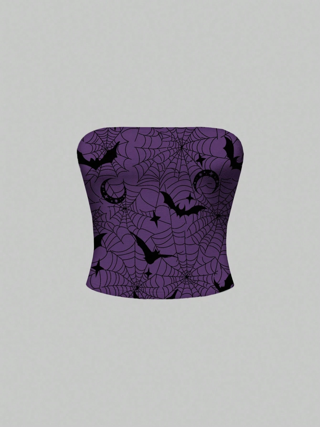 Goth Halloween dunkel lila Spinnennetz, Fledermaus, Sonne, Mond, Stern Muster Crop Top für Frauen