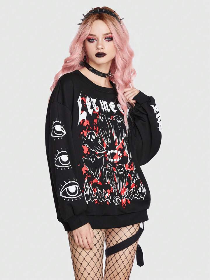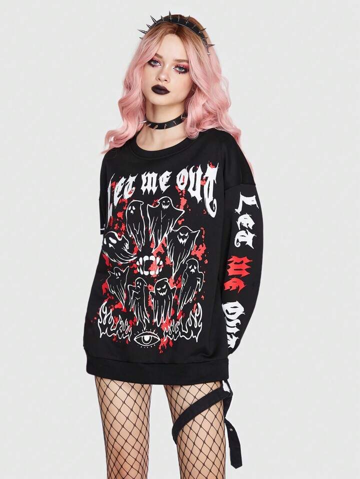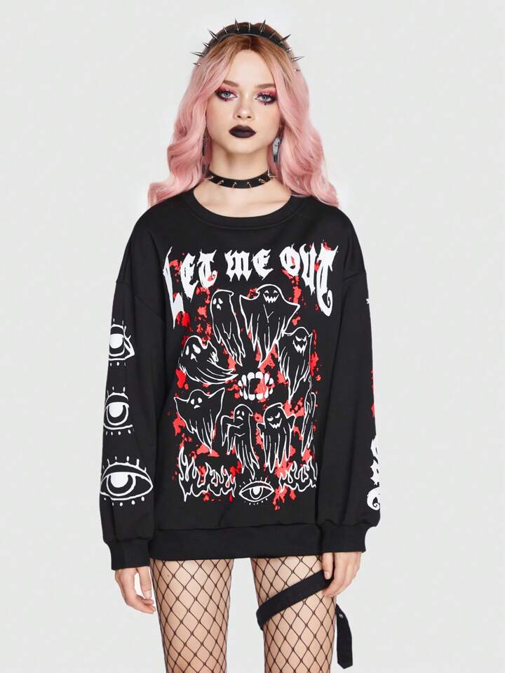 Goth Sweatshirt mit Buchstabe & Geist Grafik, Drop Shoulder
