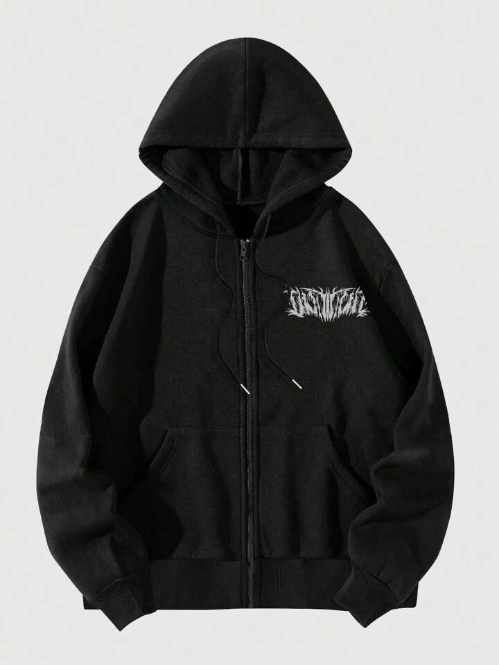 Goth Herren Totenkopf & Buchstaben Grafik Kapuzenpulli Mit Thermoisolierter Fütterung Und Kordelzug