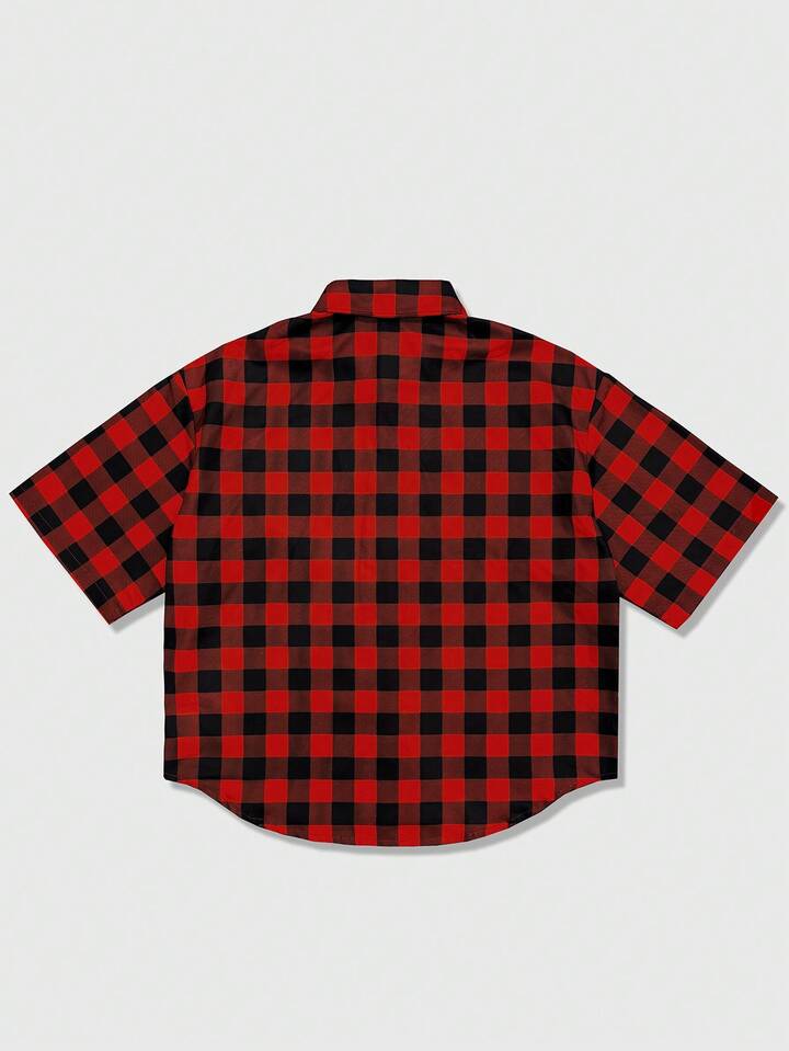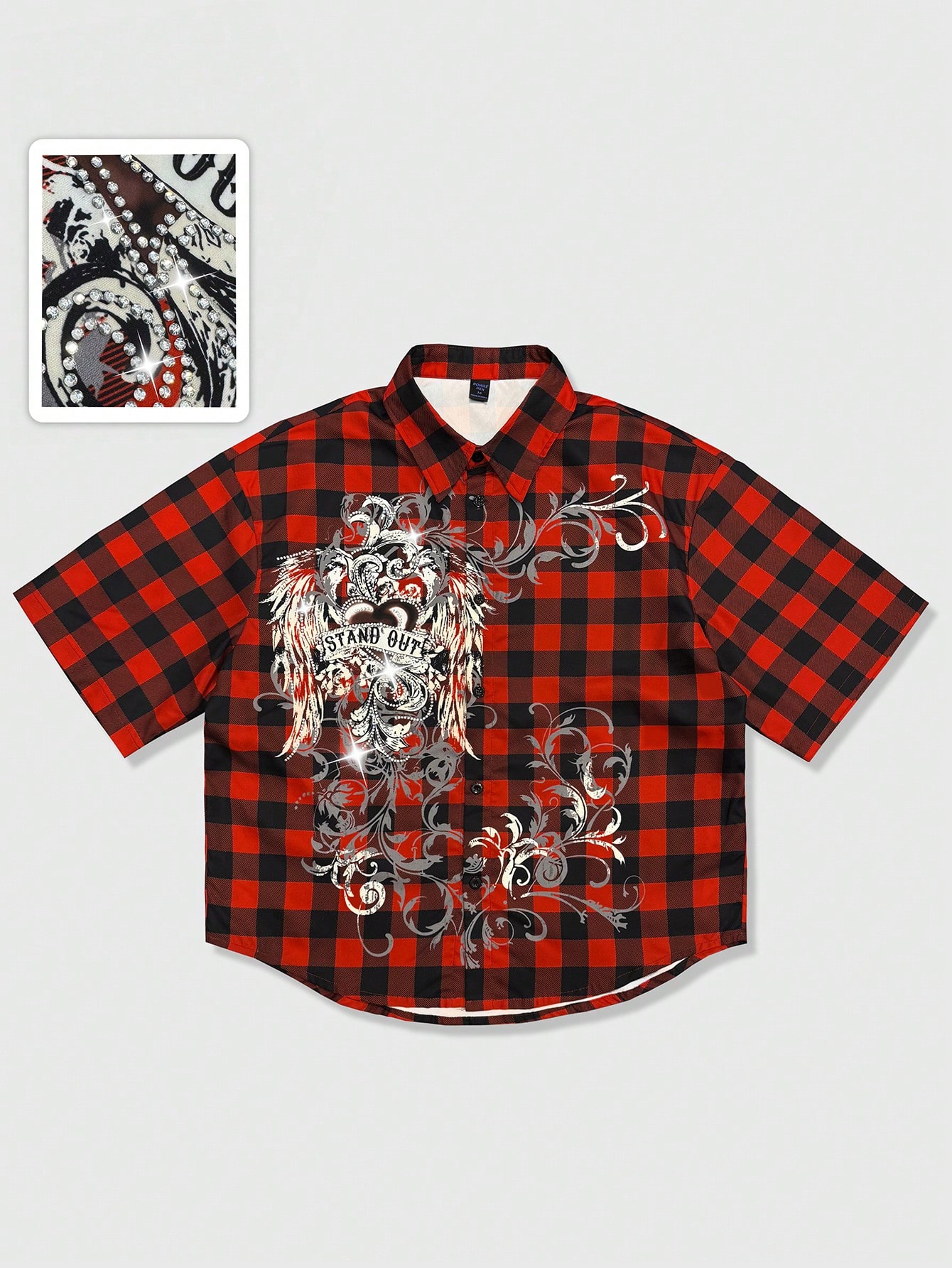 Goth Herren Sommer Lässig Karohemd mit Strass-Muster und Knopfleiste, Kurzarm