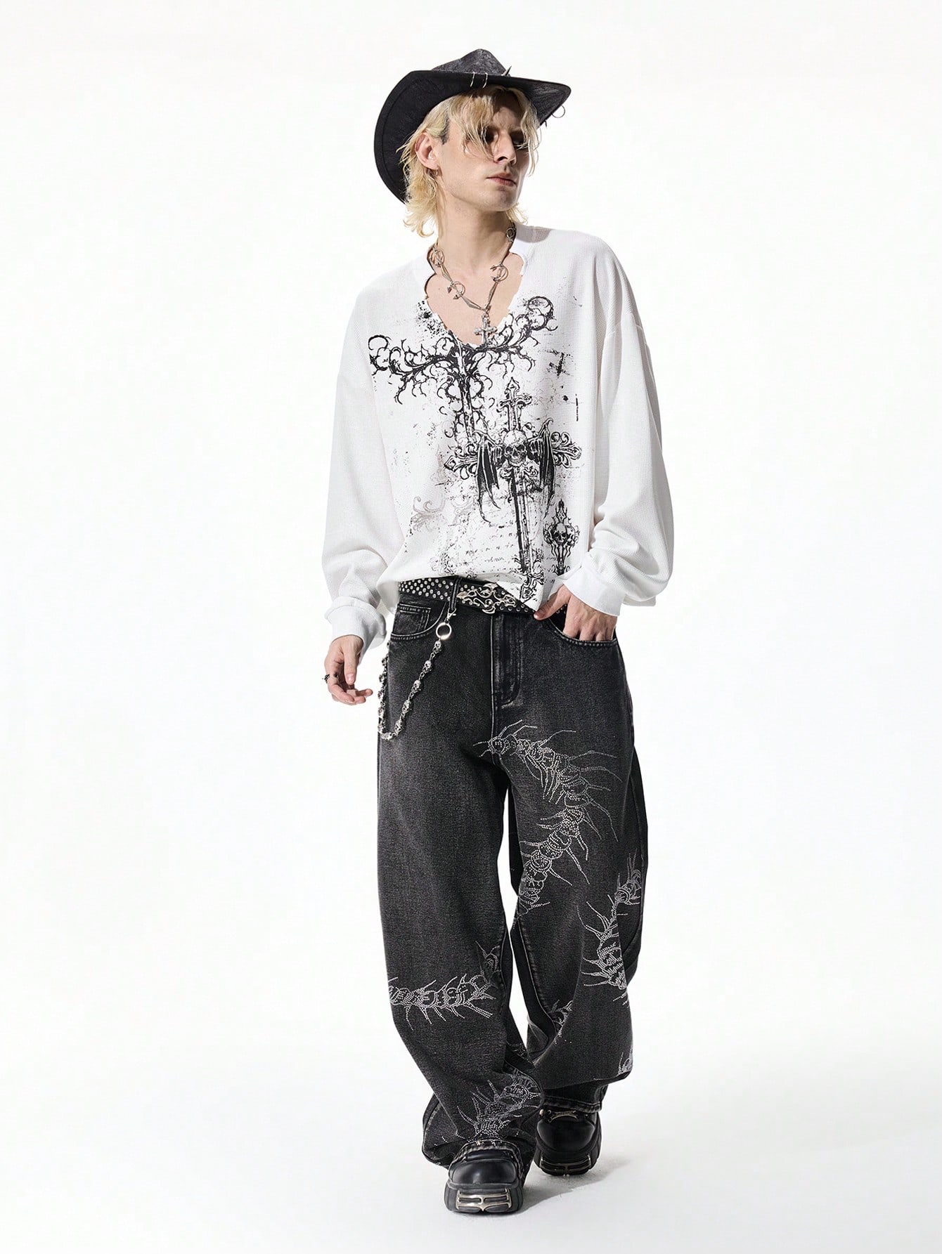 Goth Herren V-Ausschnitt Langarm Lässig Weißes T-Shirt mit Kreuz-Muster
