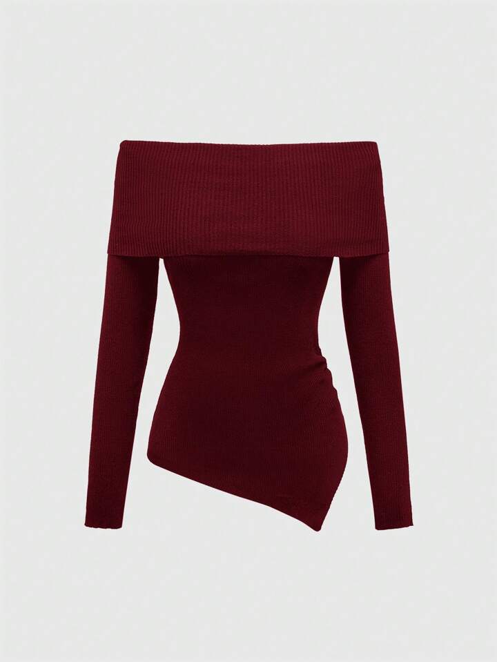 Goth Minimalistische, romantische Damen Pullover mit Schulterausschnitt, sexy asymmetrischem Saum und figurbetonter Form