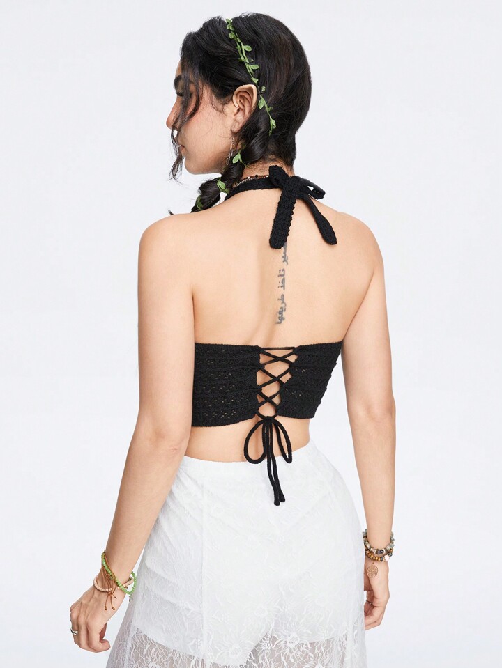 Goth Minimalistisches, sexy Sommer- und Urlaubsoberteil mit Schmetterlingsstickerei und Schleife für Frauen, gestrickt