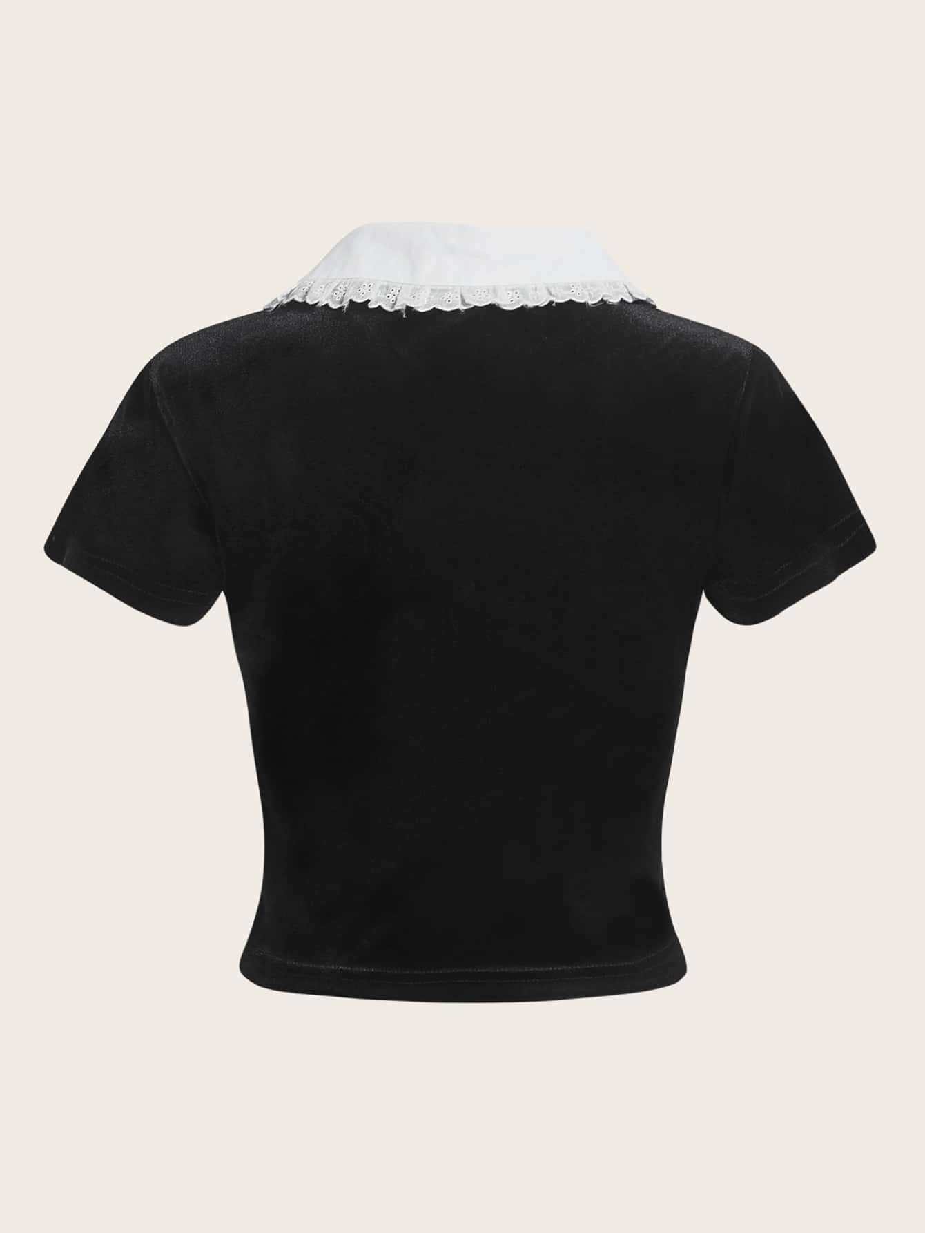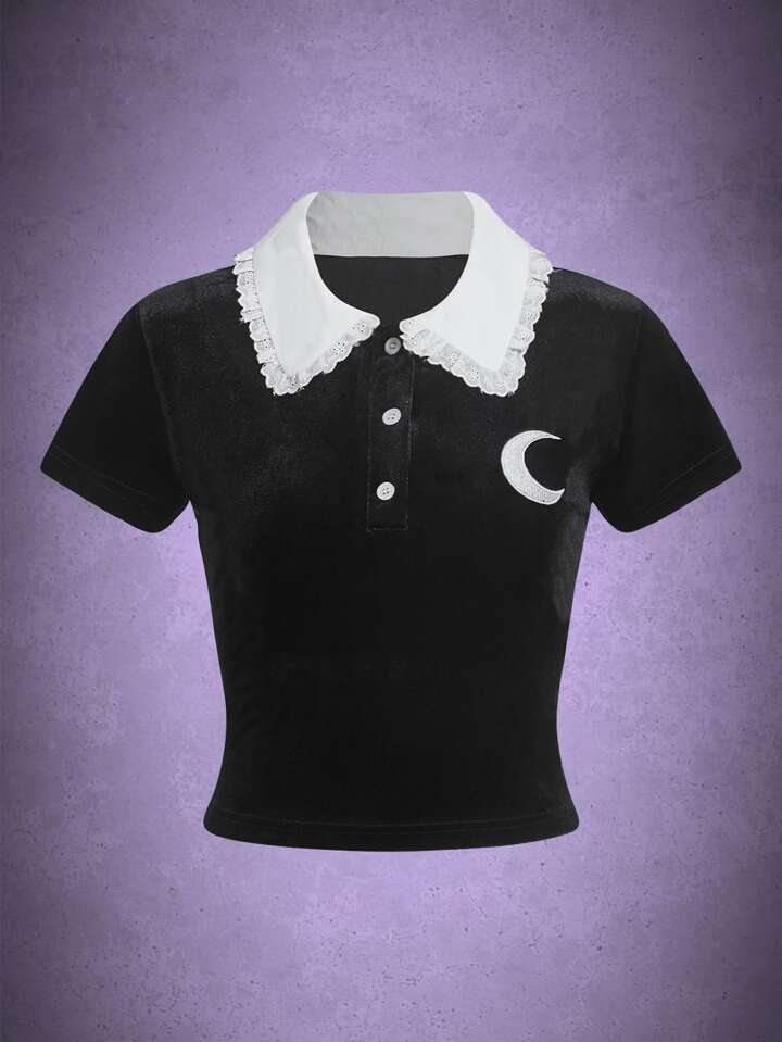 Goth T-Shirt mit Mond Stickerei, Kontrastkragen, Samt