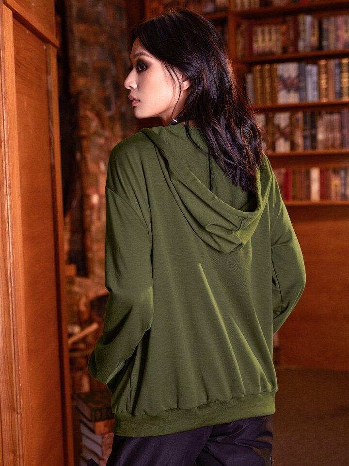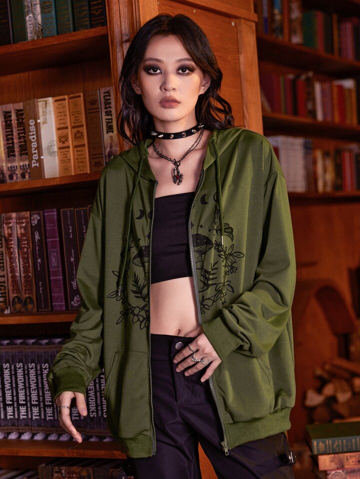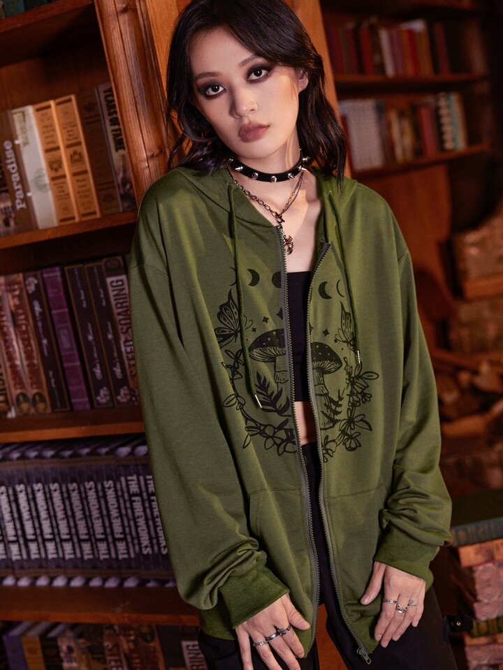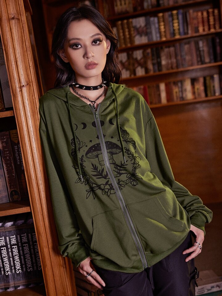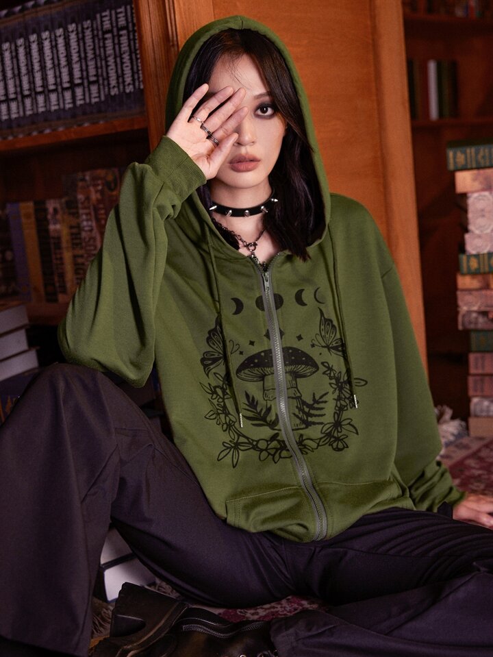 Goth Hoodie mit Pilz Grafik, Reißverschluss, Tasche