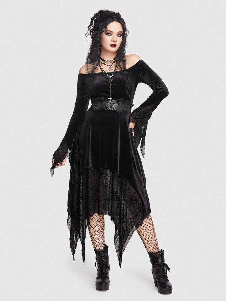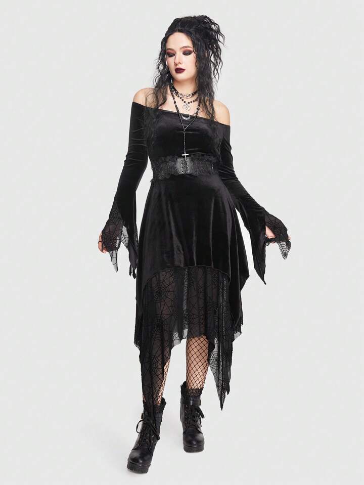 Goth Kleid mit schulterfrei Spitzenbesatz, asymmetrischem Saum, Samt