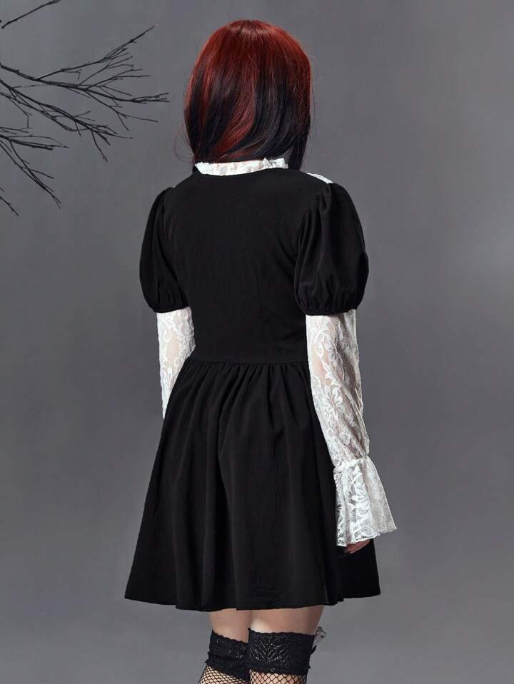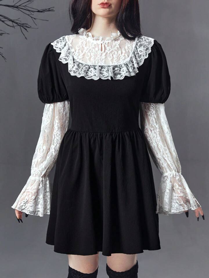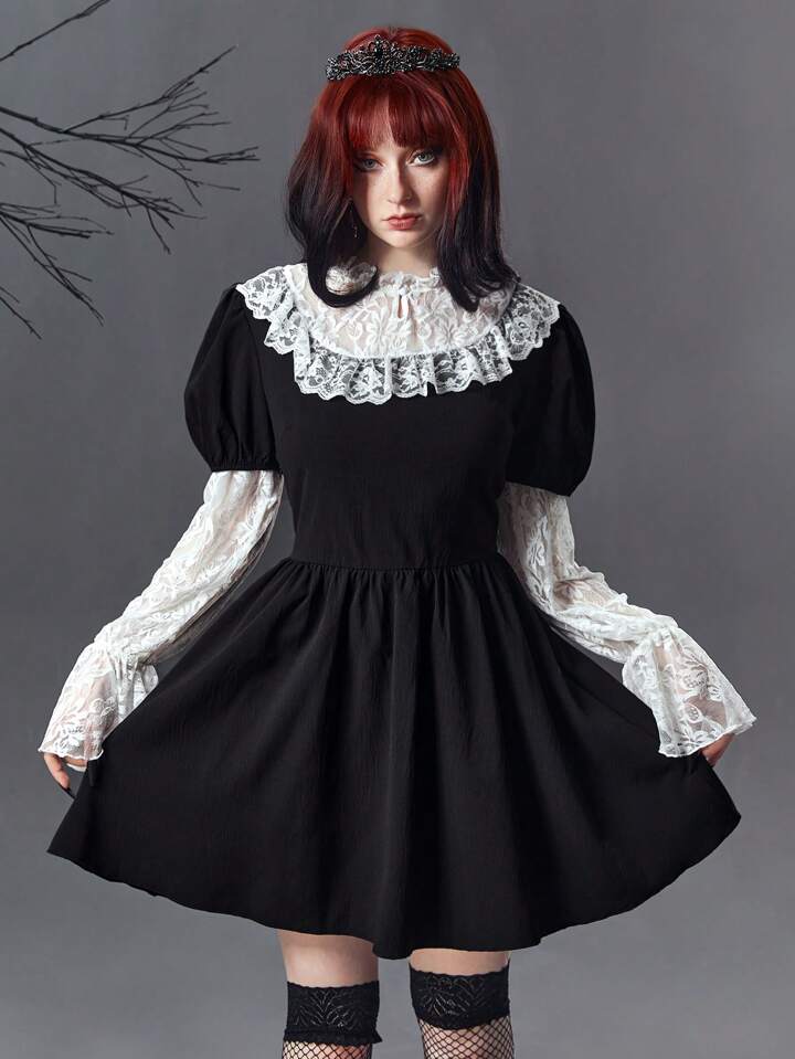 Goth Patchwork-Spitzenkleid mit Puffärmeln für Damen
