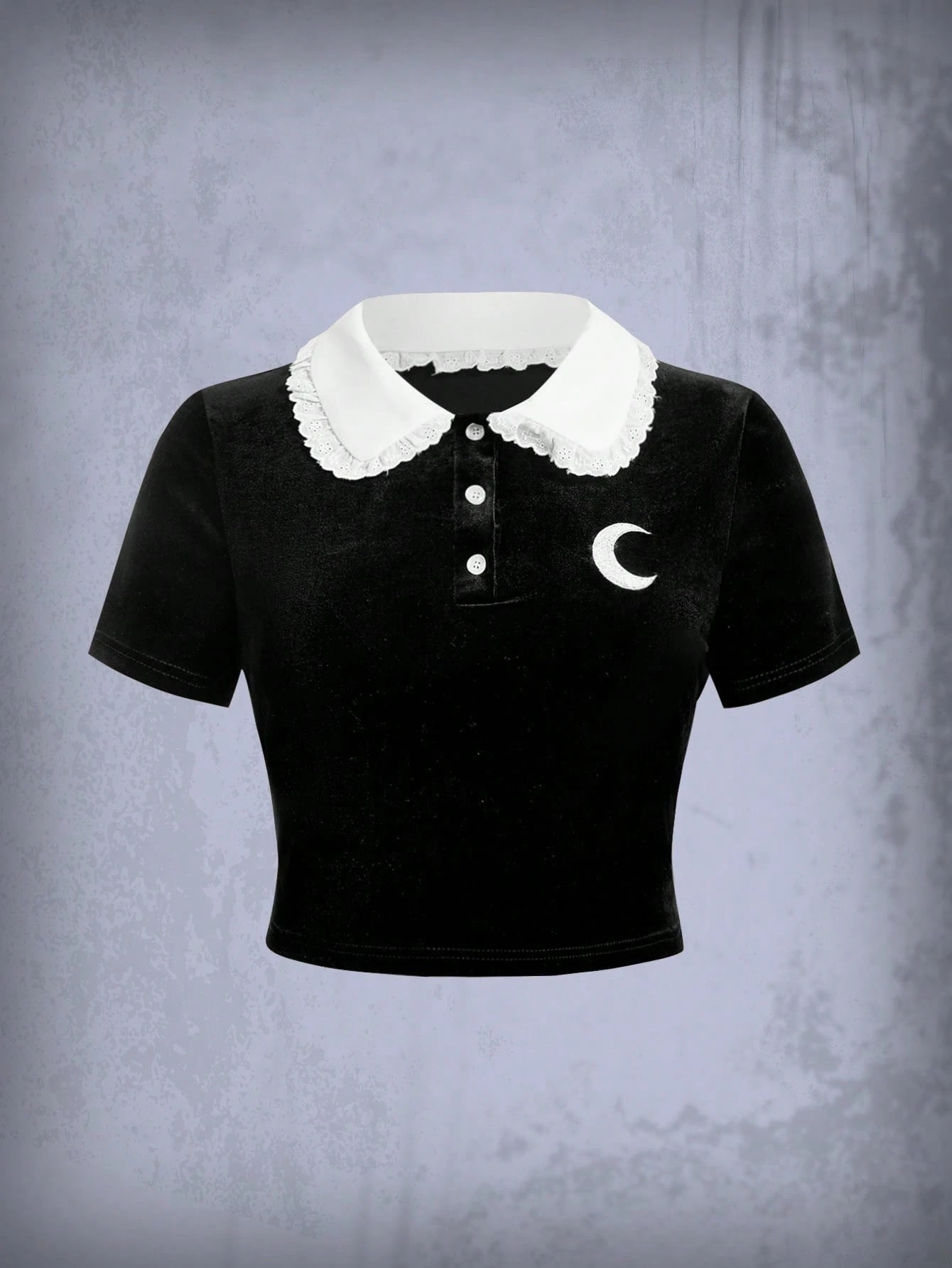 Goth T-Shirt aus Samt mit Mondstickerei und Kontrastkragen