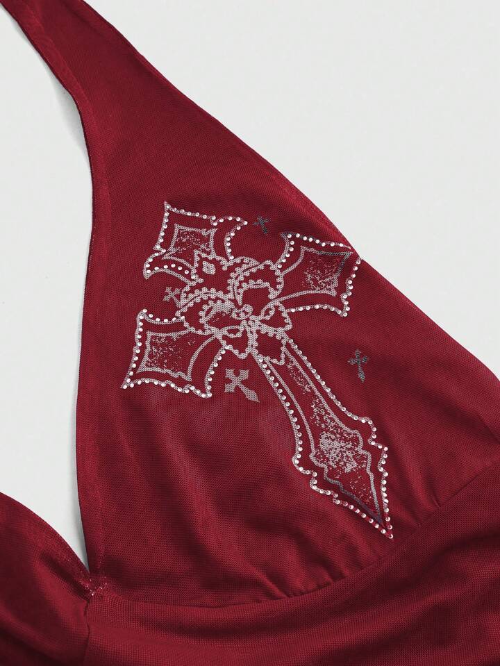 Goth Große Größe Trägertop mit Kreuzmuster, Strass-Akzenten und geraffter Seite, aus Mesh