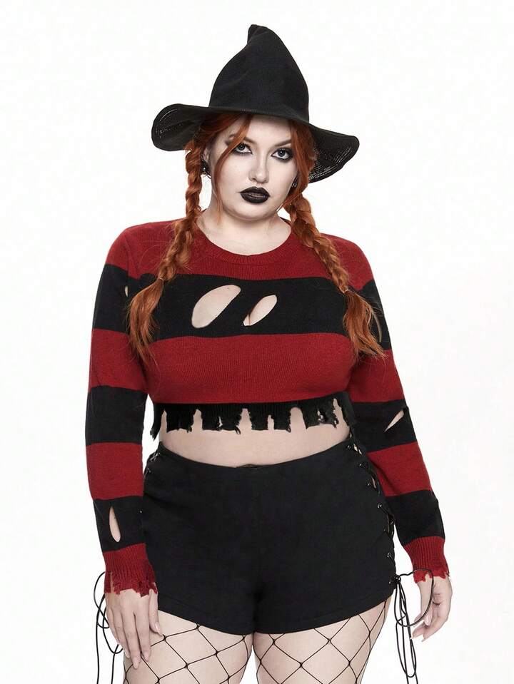 Goth Große Größen Halloween Rot & Schwarz gestreifter zerstörter kurzer Pullover