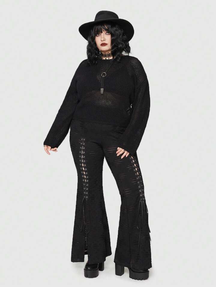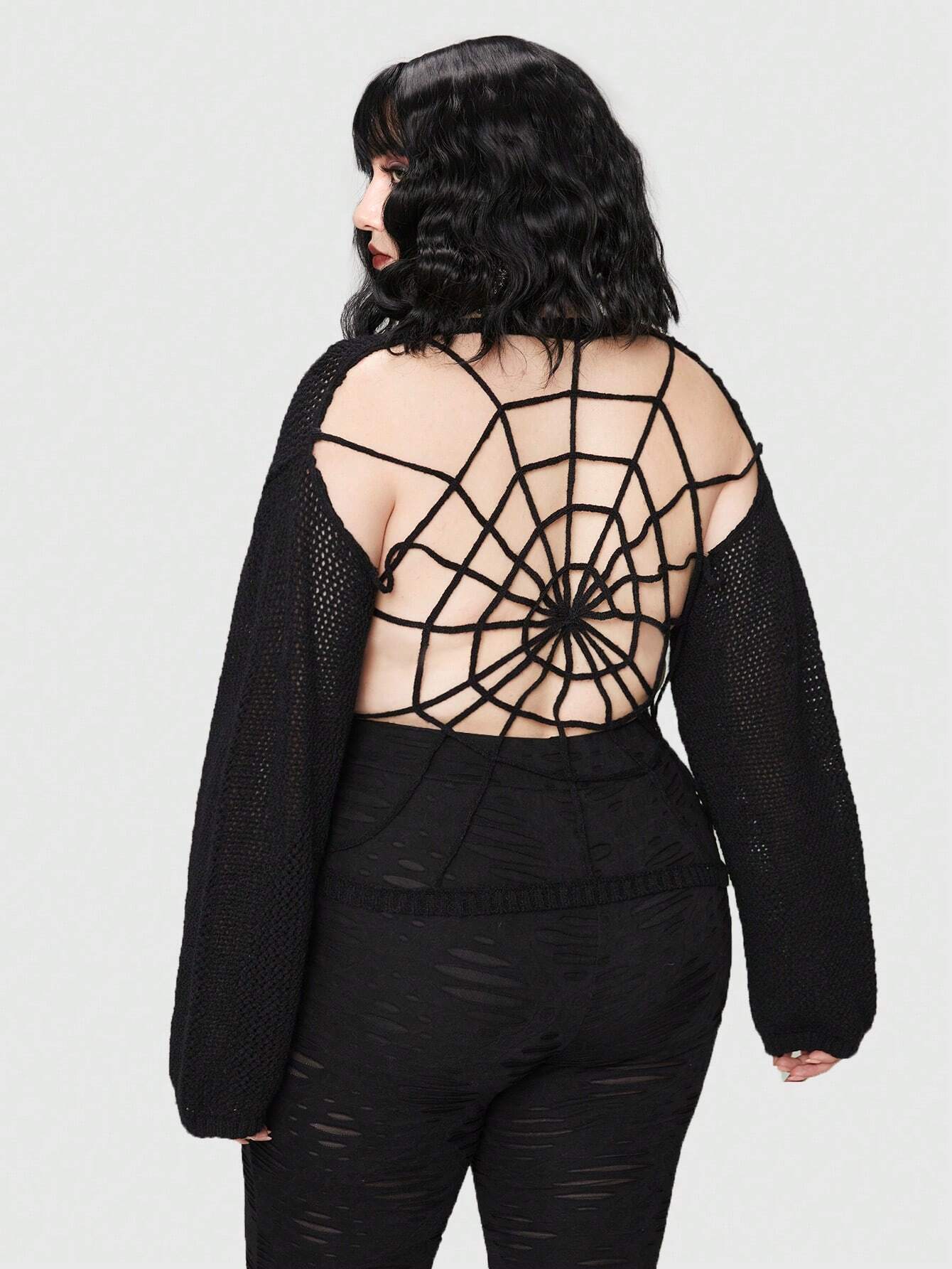 Goth Große Größe Pullover mit Spinnennetz Muster, Ausschnitt hinten, Drop Shoulder