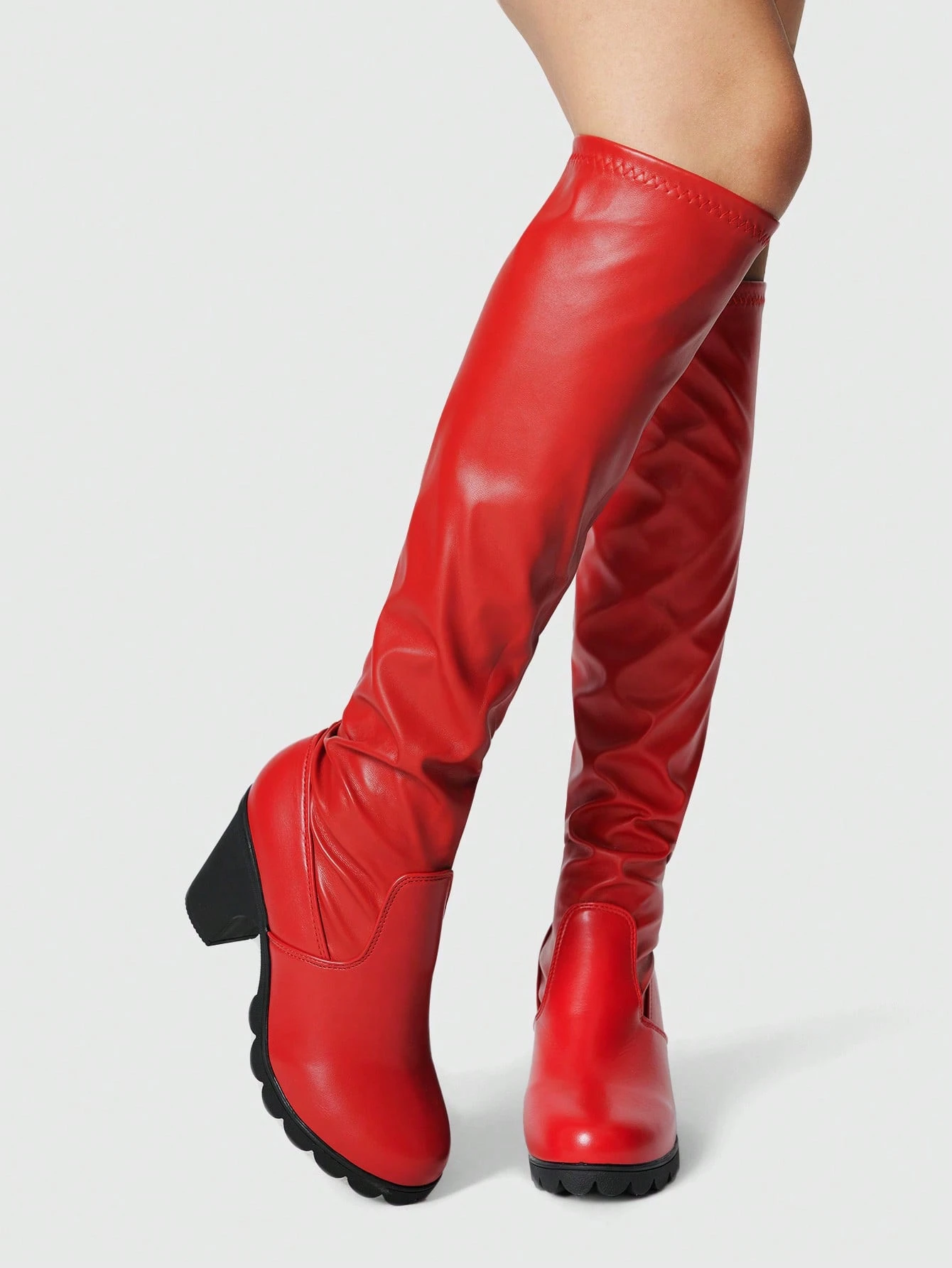 Goth Blockabsatz-Stiefel mit spitzer Kappe, Kunstleder, rot, kniehohe Punk-Stiefel