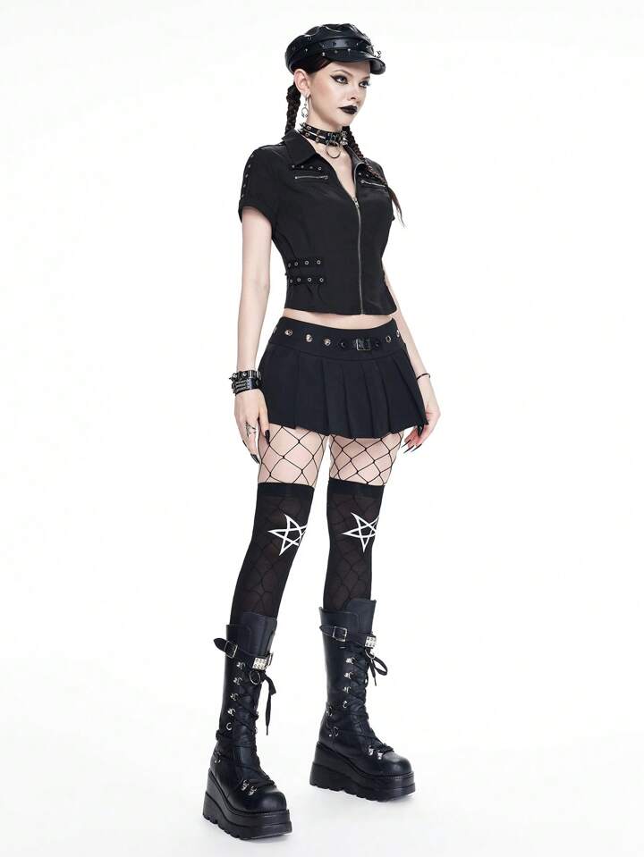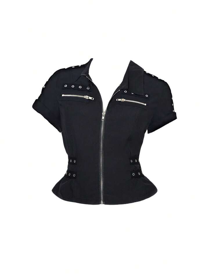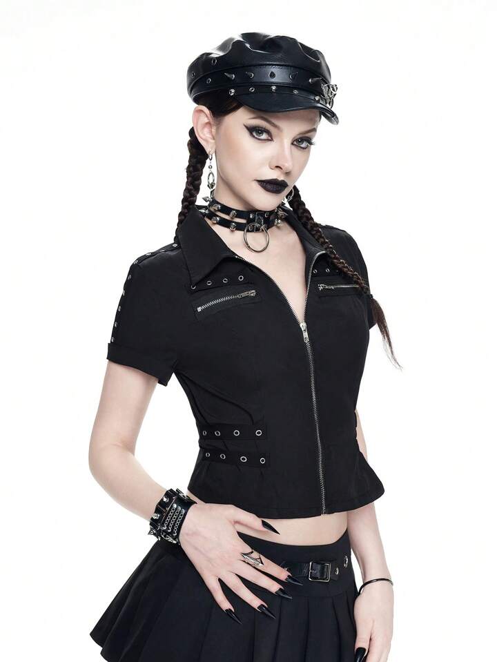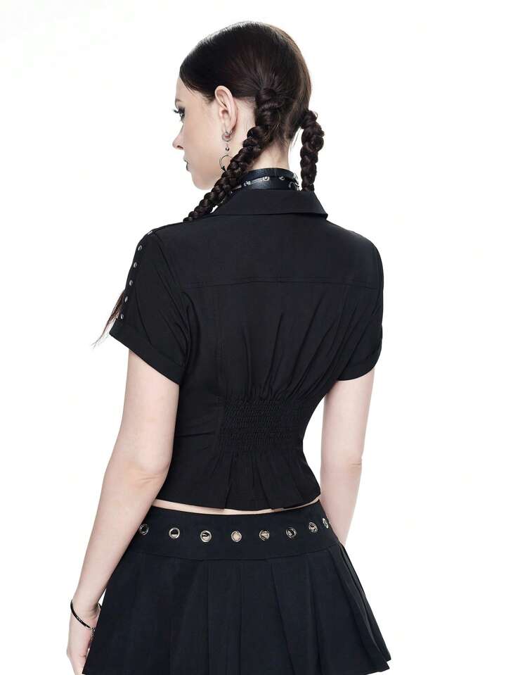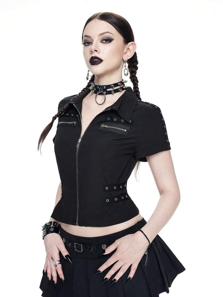 Goth Preppy Stil Ösen Design taillierter Reißverschluss Damen Bluse