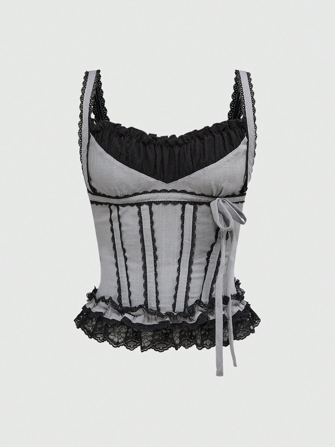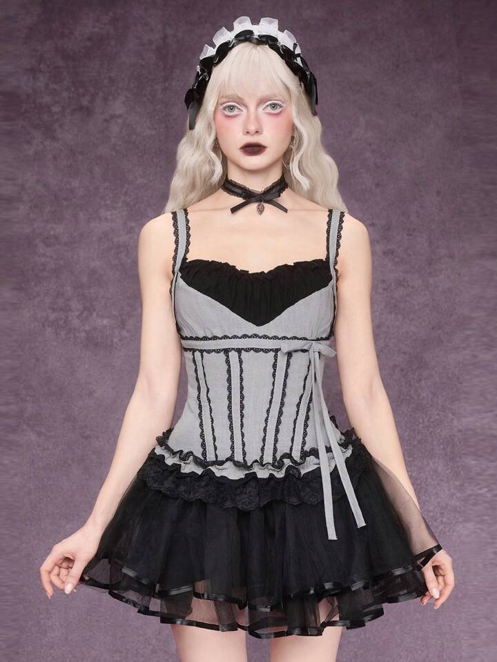 Goth Romantischer Prinzessinen-Stil Schleifendekor Kontrastartige Taillentaille Trägerhemd mit quadratischem Ausschnitt