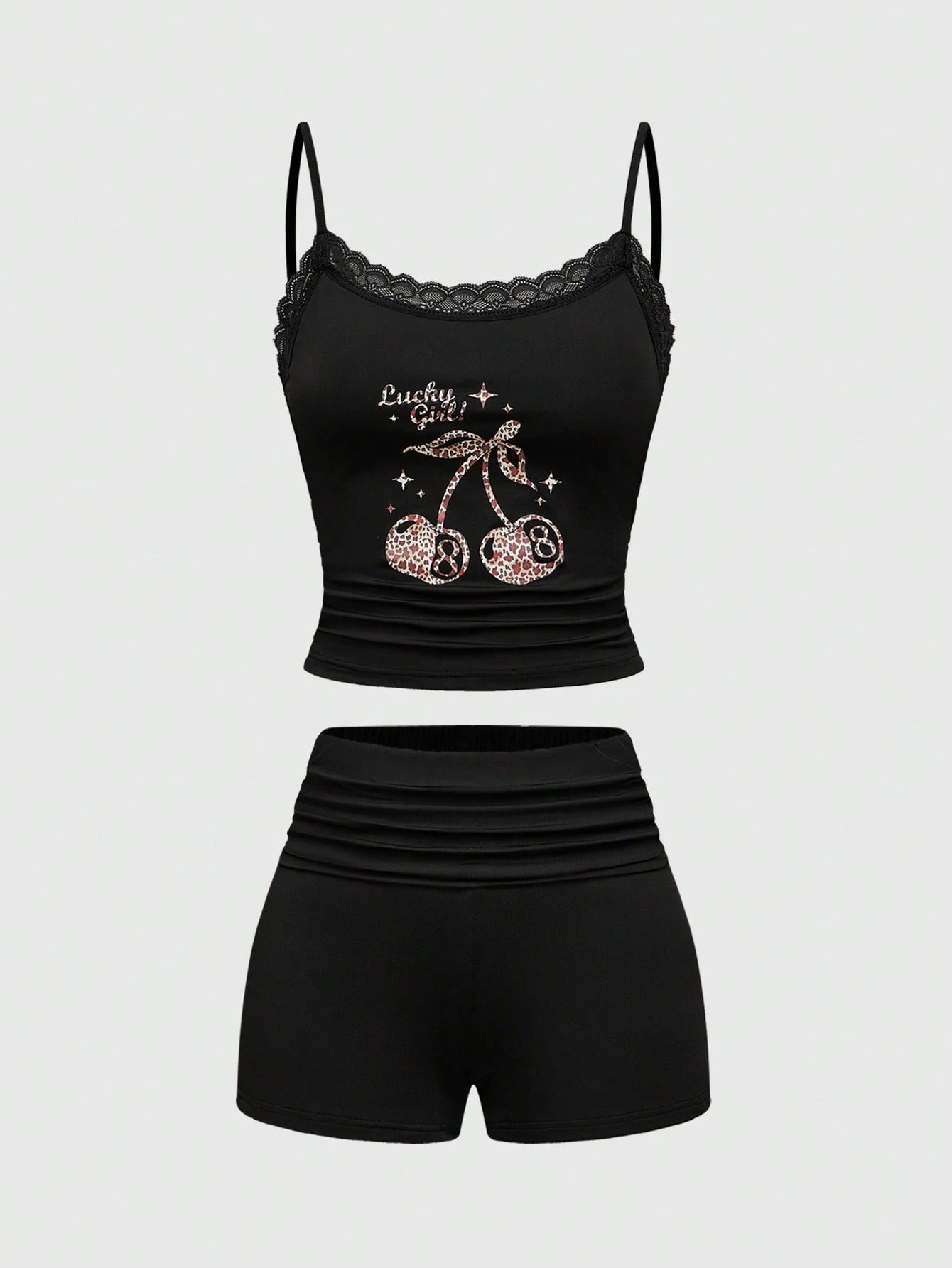 Goth Savage Y2K Kirsch-Leoparden-Muster Träger-Top und Shorts Schlafanzug-Set