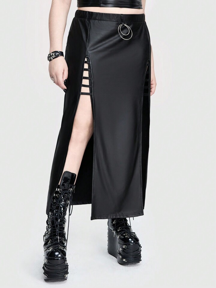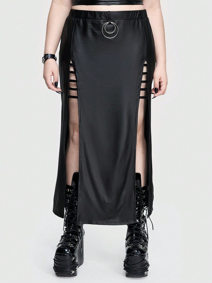 Goth Sexy, reife, elegante, hohe Schlitze, Slim Fit mit gekreuzten Trägern, runden Ringen und mondgeformten metallischen Verzierungen, dehnbarer einfarbiger Rock in Große Größen für Partys