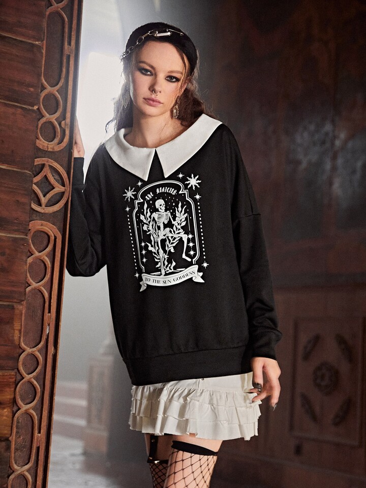 Goth Sweatshirt mit Skelett Muster, Kontrastkragen