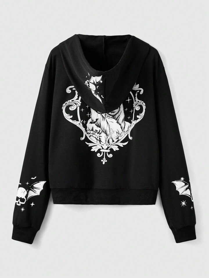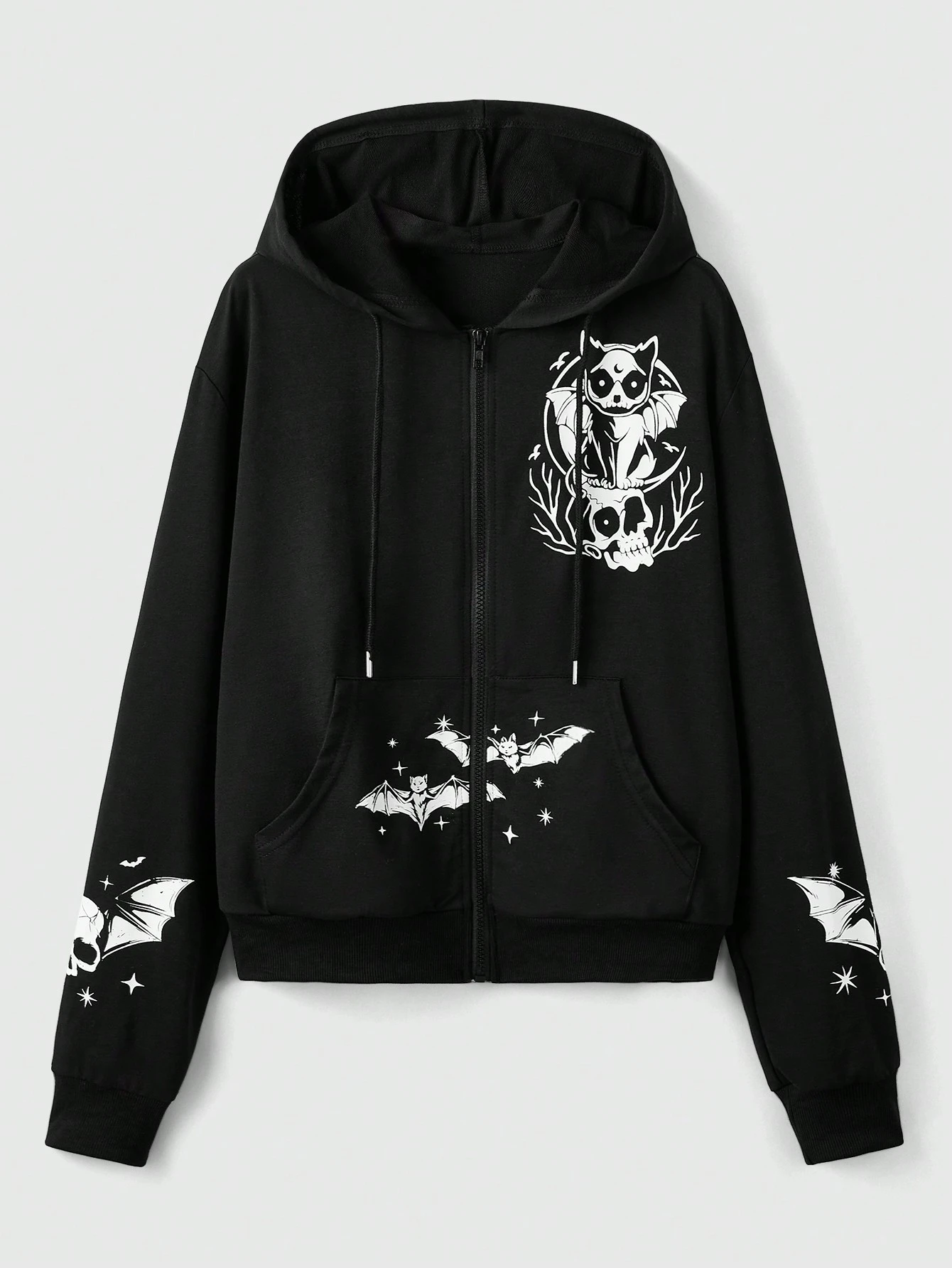Goth Hoodie mit Schädel & Fledermaus Muster, Reißverschluss, Tunnelzug,