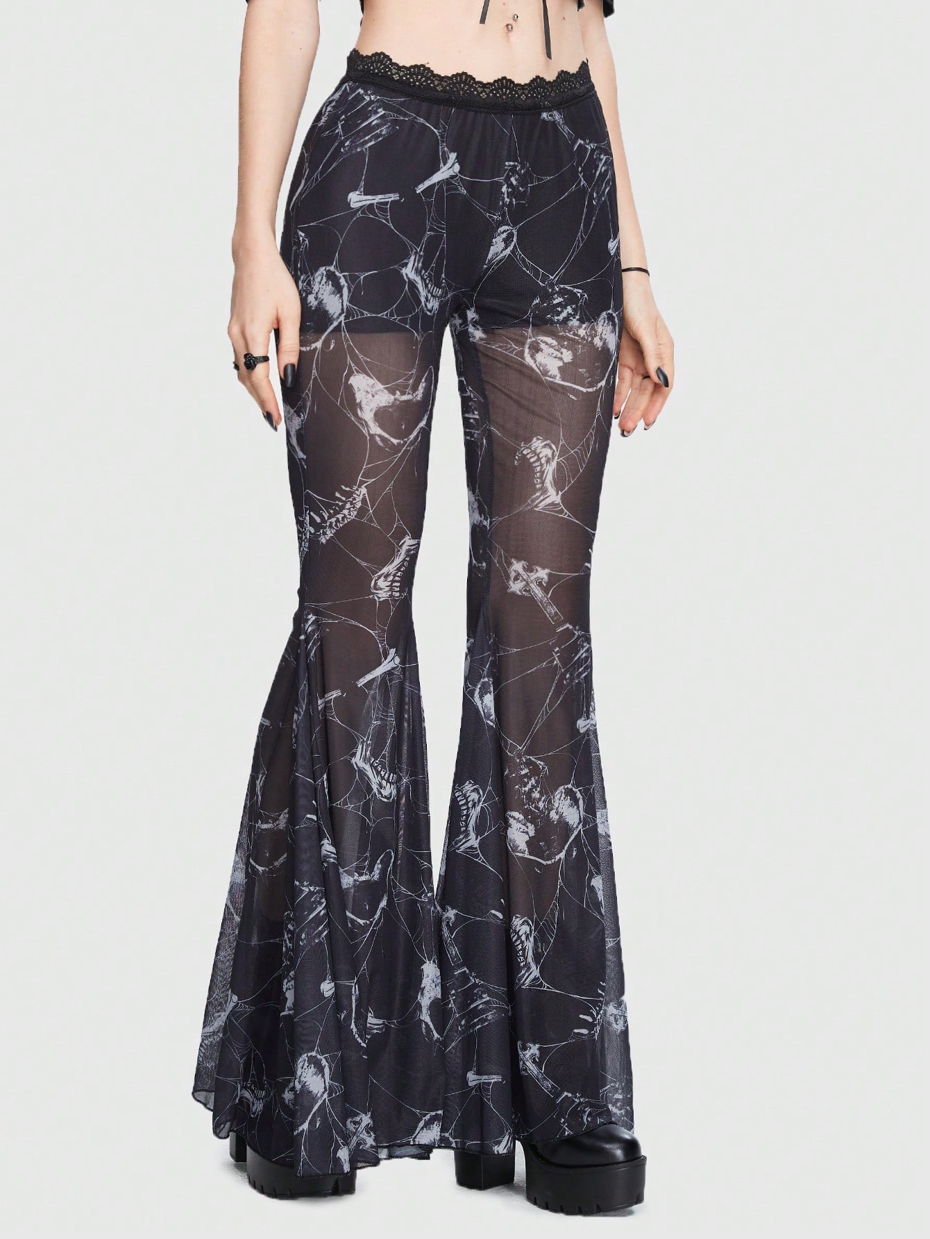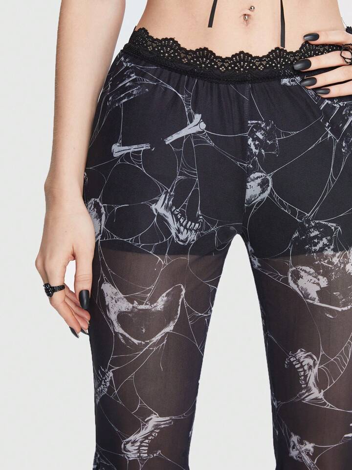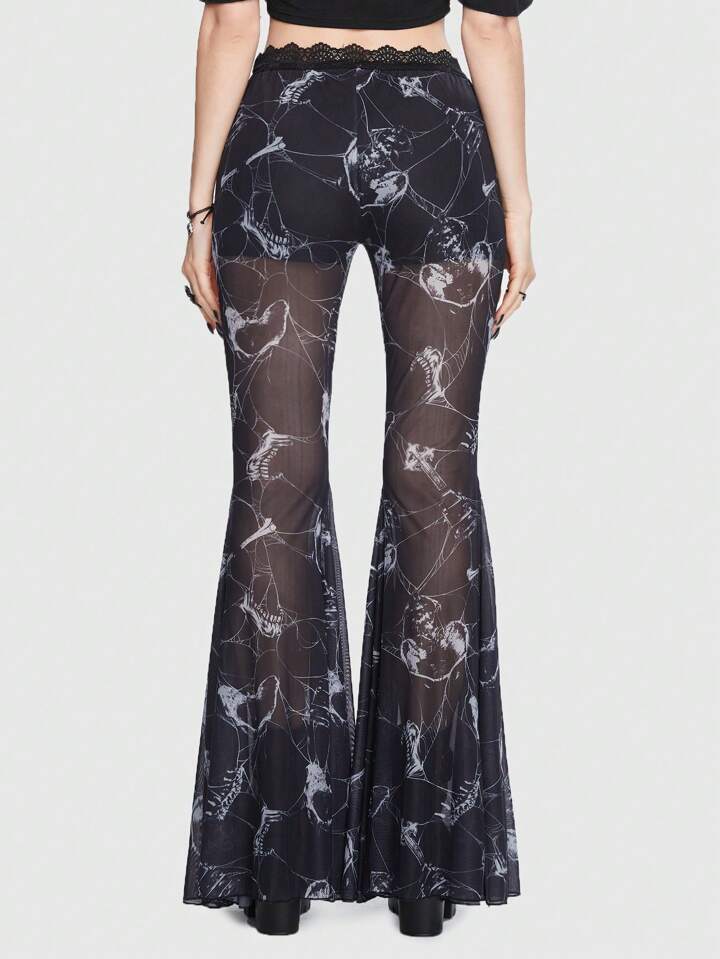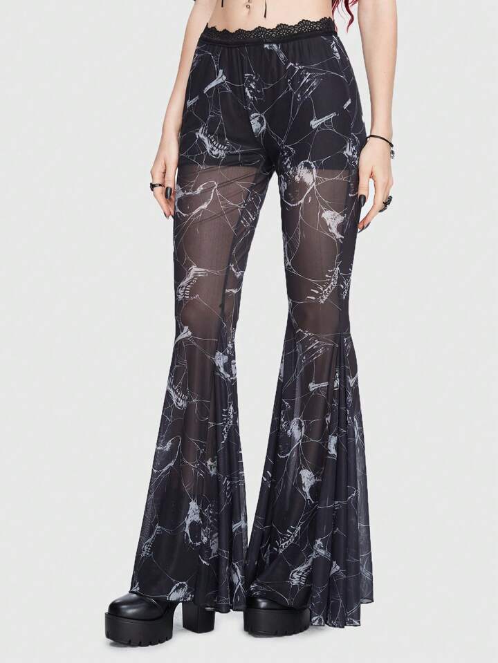 Goth Schlaghose mit Schädel Muster, Kontrast Spitzen,