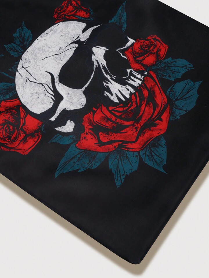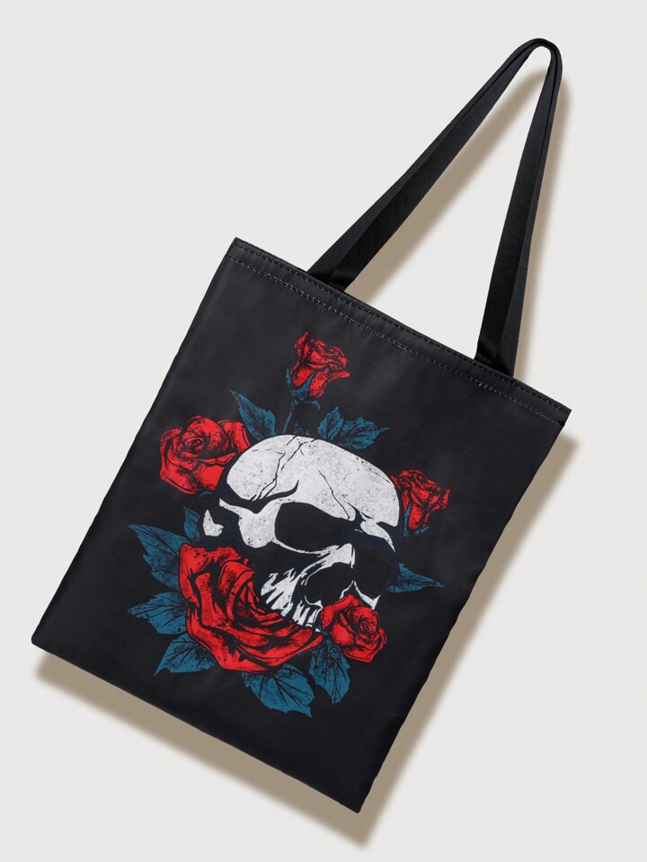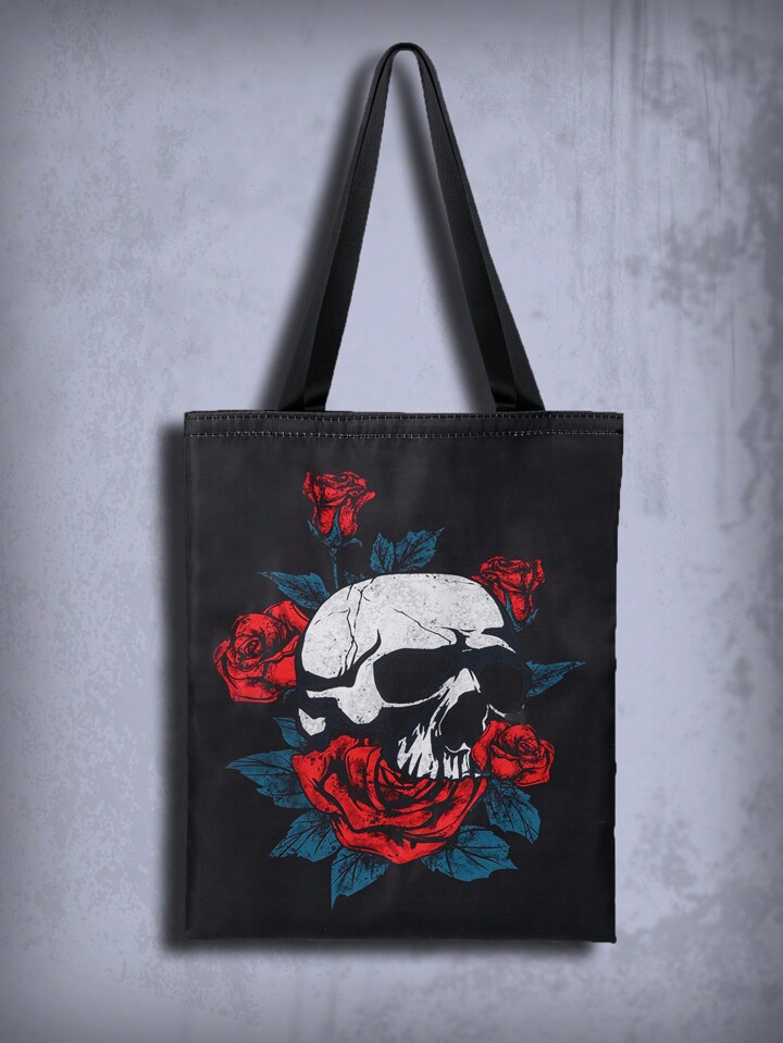 Goth Kleine Shopper Tasche mit Totenkopf und Blumengrafik, Funky Schwarz zum Einkaufen