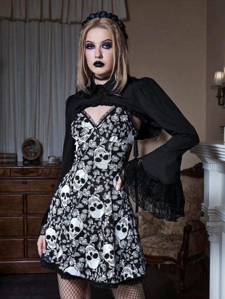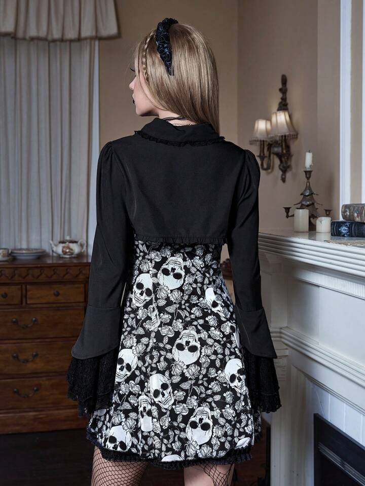 Goth Einfarbige Kontrast Spitzen Super Crop Bluse, Schule