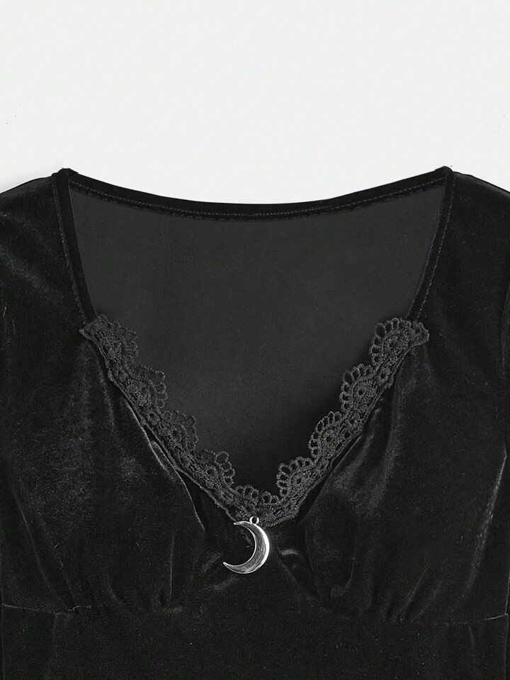 Goth Einfarbig T-Shirt mit Kontrast Spitzen